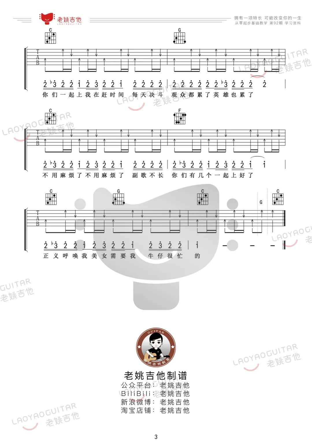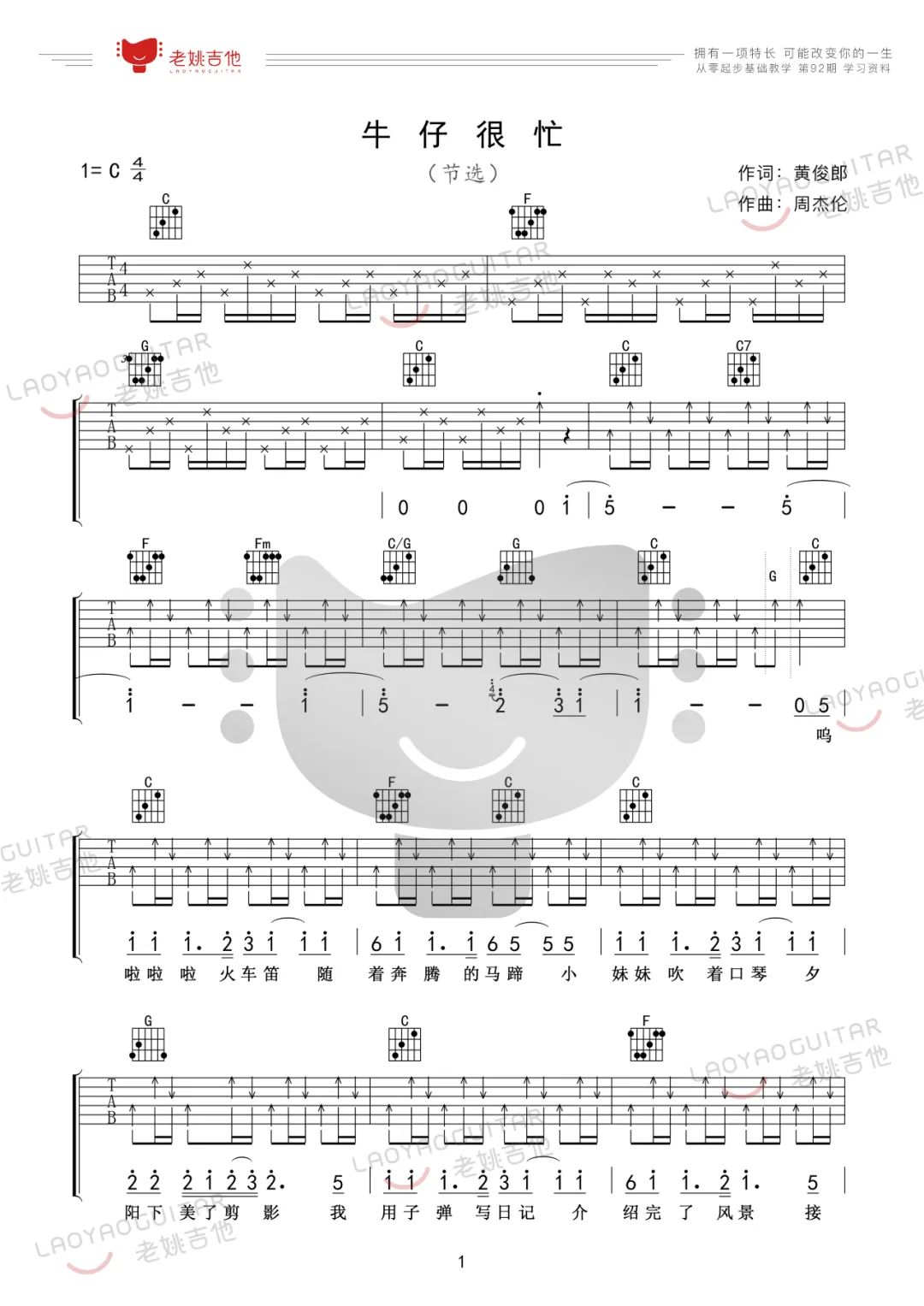 曲谱介绍: 吉他谱介绍:牛仔很忙吉他谱,周杰伦演唱的一首歌曲,4/4拍的节奏,这首歌曲的原调为C调,这里曲谱采用了C调指法进行编配,演唱时可不夹变调夹,曲谱由琴谱网更新上传,共3张高清图片弹唱吉他谱例,来源于@老姚吉他编配出品。歌曲以第一人称的角度,以牛仔“我很忙”道出年轻一代四处开疆拓土、打拼冲锋的心声。不过这个牛仔可不是西部片中深沉老练的传统形象,而是更为活泼、率真、亲切的“新生代牛仔”。 牛仔很忙吉他弹唱教学