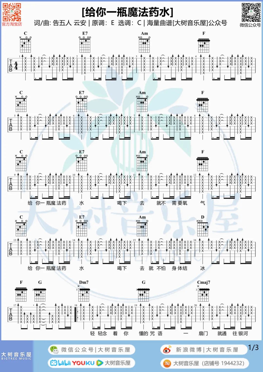 曲谱介绍: 吉他谱介绍:给你一瓶魔法药水吉他谱,告五人演唱的一首歌曲,4/4拍的节奏,这首歌曲的原调为E调,这里曲谱采用了C调指法进行编配,演唱时夹变调夹4品可回到原调,也可根据个人实际嗓音情况选择。曲谱由琴谱网更新上传,共4张高清图片弹唱吉他谱例,来源于@大树音乐屋编配出品。点缀的音符的确是我的心跳,但牵着你的手的确我也开始害怕失去。 给你一瓶魔法药水吉他弹唱教学