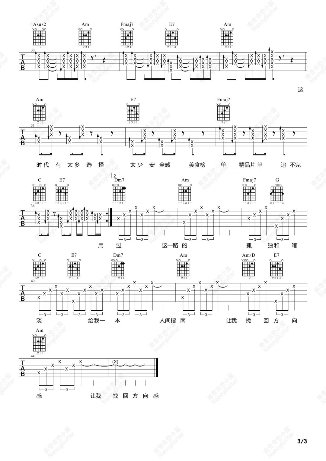 曲谱介绍: 吉他谱介绍:人间指南吉他谱,陈婧霏演唱的一首歌曲,4/4拍的节奏,这首歌曲的原调为B调,这里曲谱采用了C调指法进行编配,演唱时降半音调弦可回到原调,也可根据个人实际嗓音情况选择不降音或夹几品。曲谱由琴谱网更新上传,共3张高清图片弹唱吉他谱例,来源于@南音吉他编配出品。在这首歌中陈婧霏用声音来连接不同时空,完成一场用音乐解构电影跨界实验。 人间指南吉他弹唱教学
