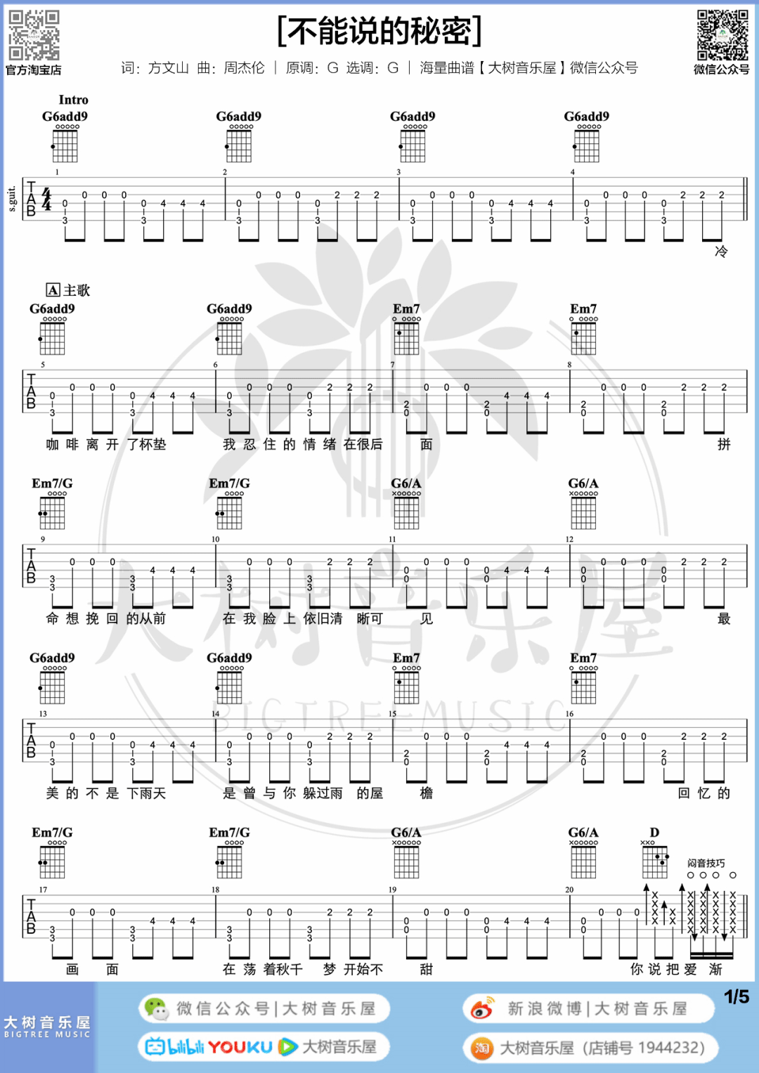 曲谱介绍: 吉他谱介绍:不能说的秘密吉他谱,周杰伦演唱的一首歌曲,4/4拍的节奏,这首歌曲的原调为G调,这里曲谱采用了G调指法进行编配,演唱时可不夹变调夹,曲谱由琴谱网更新上传,共5张高清图片弹唱吉他谱例,来源于@大树音乐屋编配出品。周杰伦把歌词唱明白了,却是教人心碎的一首歌。有些人注定就是命运安排来跟我们遇见的,只是命运它忘了把她留在我们身边,教人相恋,又教人相离。 不能说的秘密吉他弹唱教学