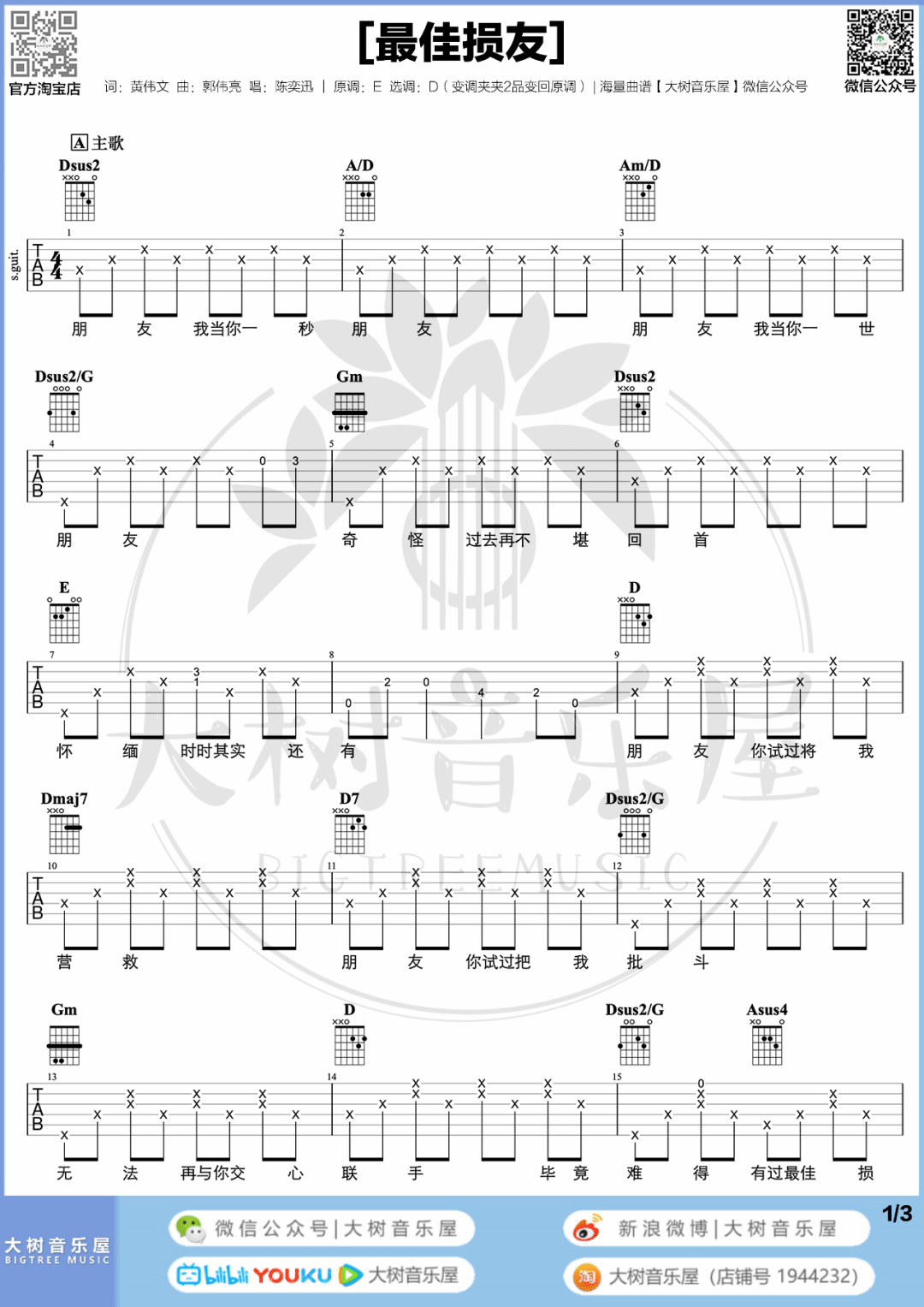 曲谱介绍: 吉他谱介绍:最佳损友吉他谱,陈奕迅演唱的一首歌曲,4/4拍的节奏,这首歌曲的原调为E调,这里曲谱采用了D调指法进行编配,演唱时夹变调夹2品可回到原调,也可根据个人实际嗓音情况选择。曲谱由琴谱网更新上传,共4张高清图片弹唱吉他谱例,来源于@大树音乐屋编配出品。这首歌还有比较简单版本采用C调指法编配的和弦谱,如果觉得D调指法编配难度比较大的琴友,可以参考一下这个C调指法,相信会简单很多。 最佳损友吉他弹唱教学
