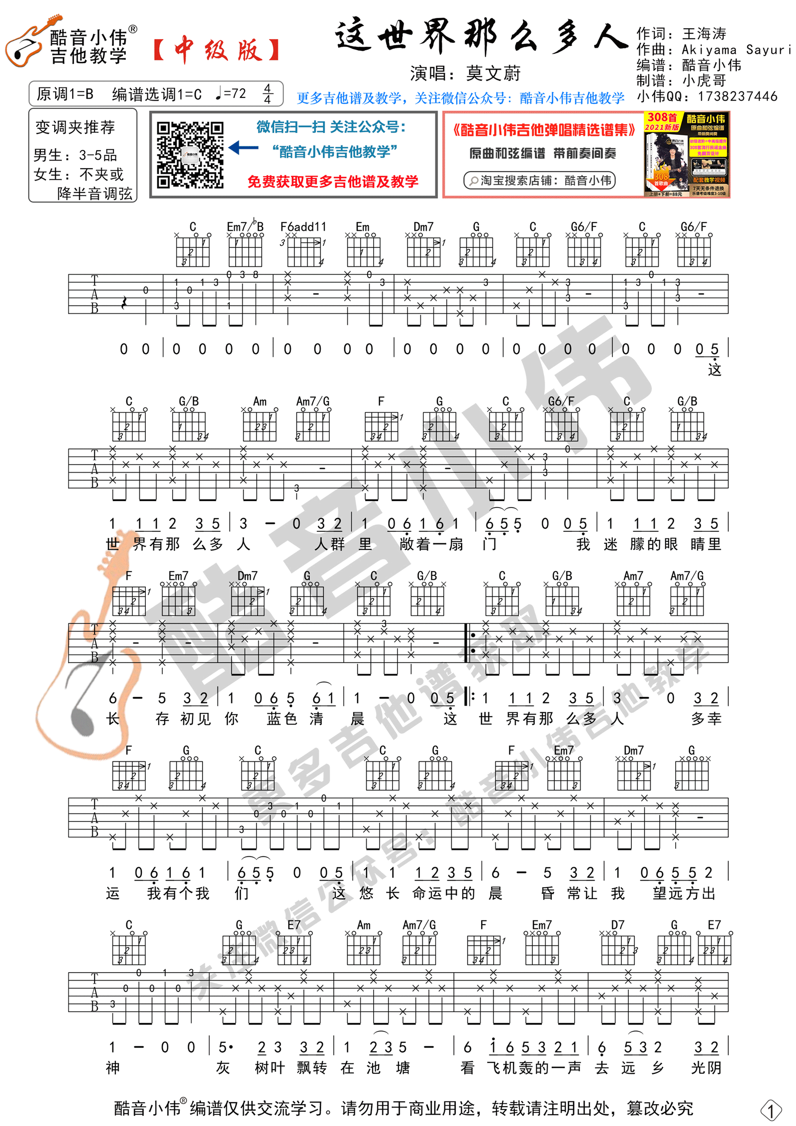 曲谱介绍: 吉他谱介绍:这世界那么多人吉他谱,莫文蔚演唱的一首歌曲,4/4拍的节奏,这首歌曲的原调为B调,这里曲谱采用了C调指法进行编配,演唱时降半音调弦可回到原调,也可根据个人实际嗓音情况选择不降音或夹几品。曲谱由琴谱网更新上传,共2张高清图片弹唱吉他谱例,来源于@酷音小伟编配出品。这首歌是电影《我要我们在一起》里面的原声带,由实力唱将莫文蔚演唱。莫文蔚动情的歌声、细腻的表达,不仅唱出爱而不得的心酸和遗憾,更有对逝去爱情的缅怀和感谢。 这世界那么多人吉他弹唱教学
