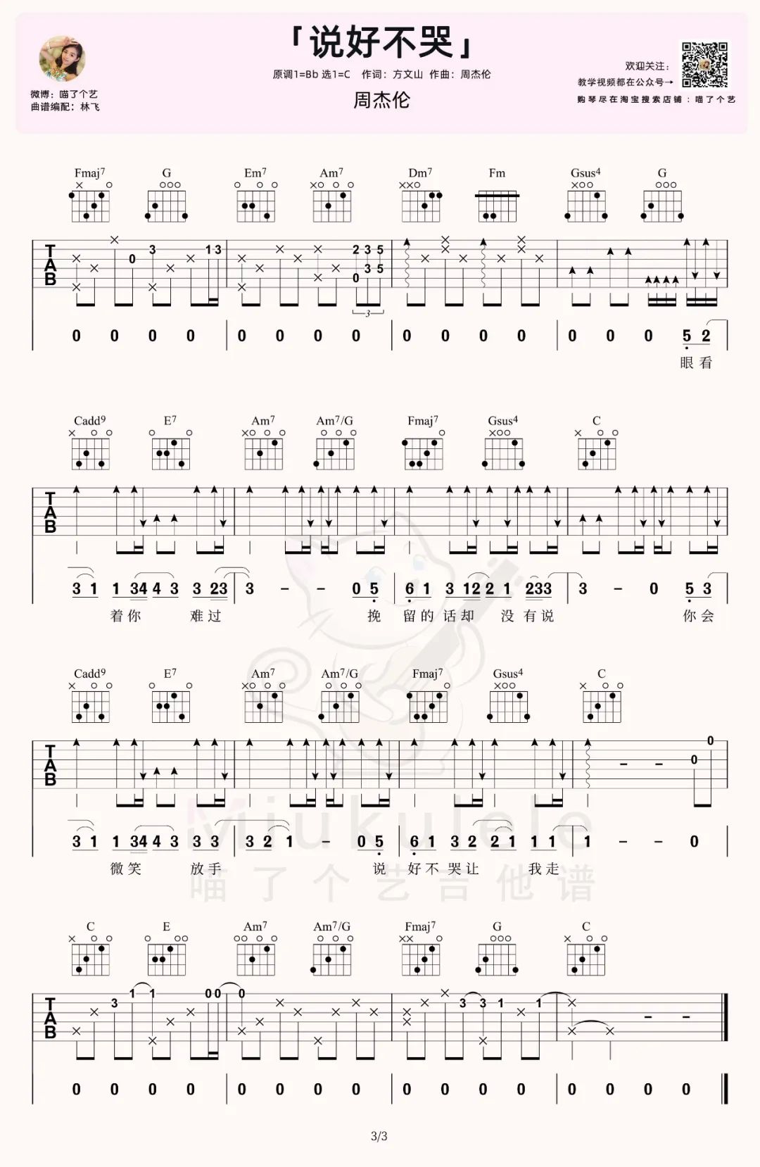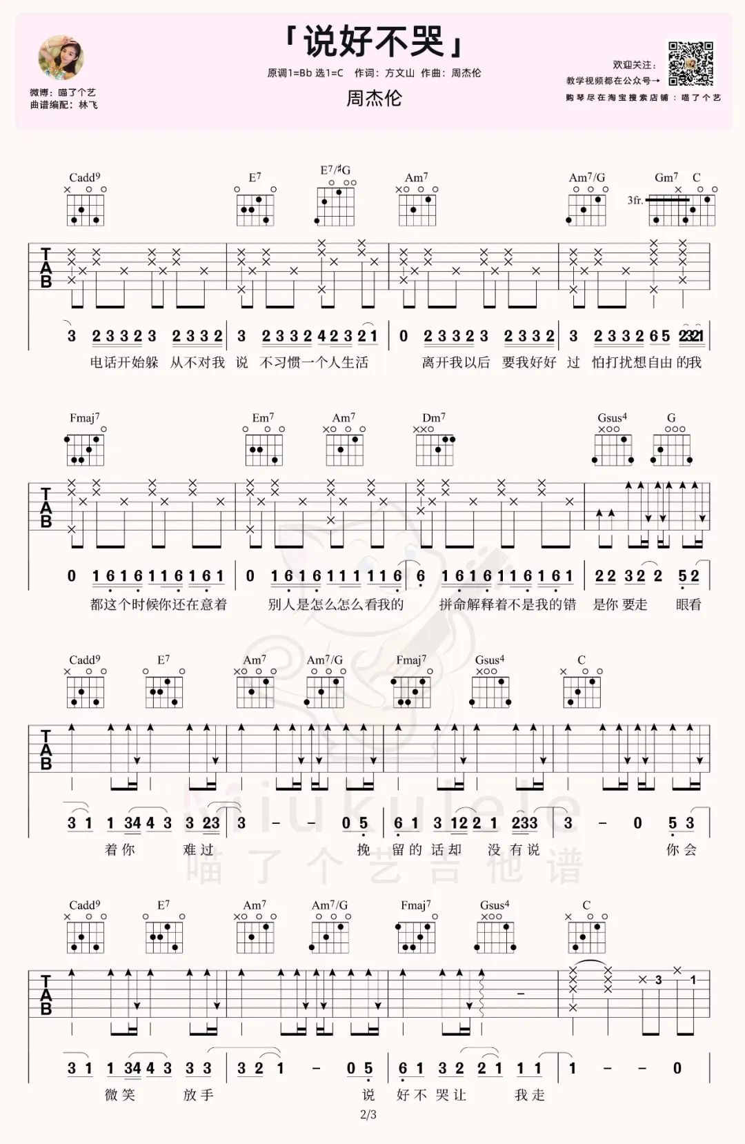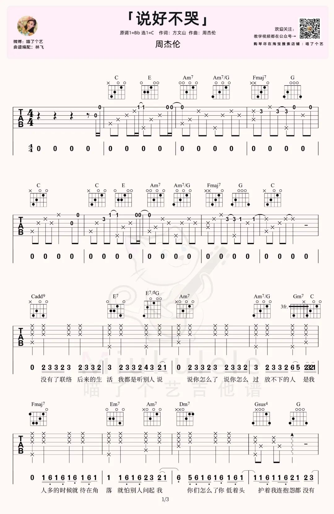 曲谱介绍: 吉他谱介绍:说好不哭吉他谱,周杰伦演唱的一首歌曲,4/4拍的节奏,这首歌曲的原调为降B调,这里曲谱采用了C调指法进行编配,演唱时可根据个人情况选择变调夹,曲谱由琴谱网更新上传,共3张高清图片弹唱吉他谱例,来源于@喵了个艺编配出品。“眼看着你难过,挽留的话却没有说你会微笑放手,说好不哭让我走”。说好不哭是一首关于成全与约定的情歌,但吉他谱弹到哭,大家一起哭。 说好不哭吉他弹唱教学