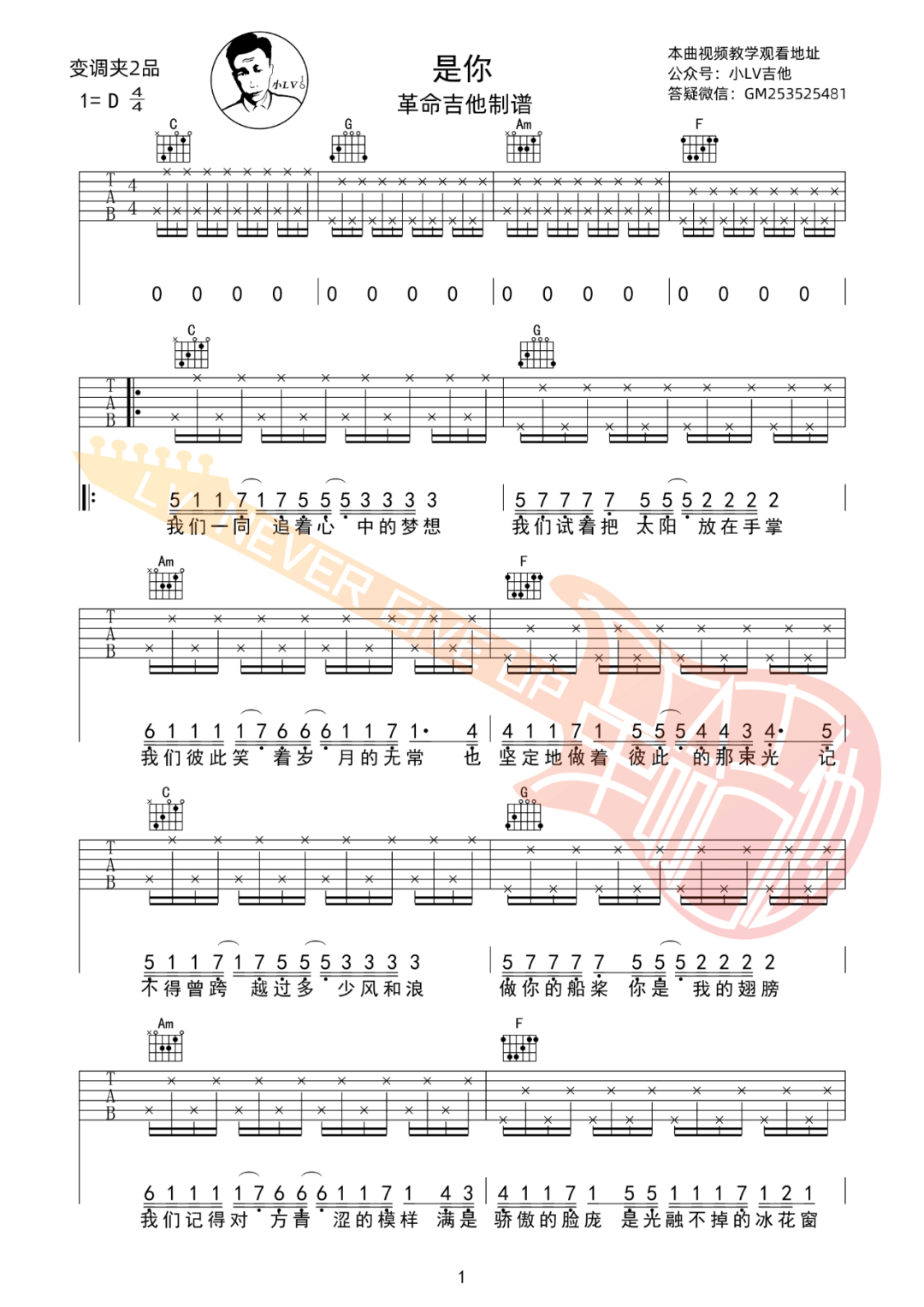 曲谱介绍: 吉他谱介绍:是你吉他谱,梦然演唱的一首歌曲,4/4拍的节奏,这首歌曲的原调为D调,这里曲谱采用了C调指法进行编配,演唱时夹变调夹2品可回到原调,也可根据个人实际嗓音情况选择。曲谱由琴谱网更新上传,共3张高清图片弹唱吉他谱例,来源于@革命吉他编配出品。 是你吉他弹唱教学