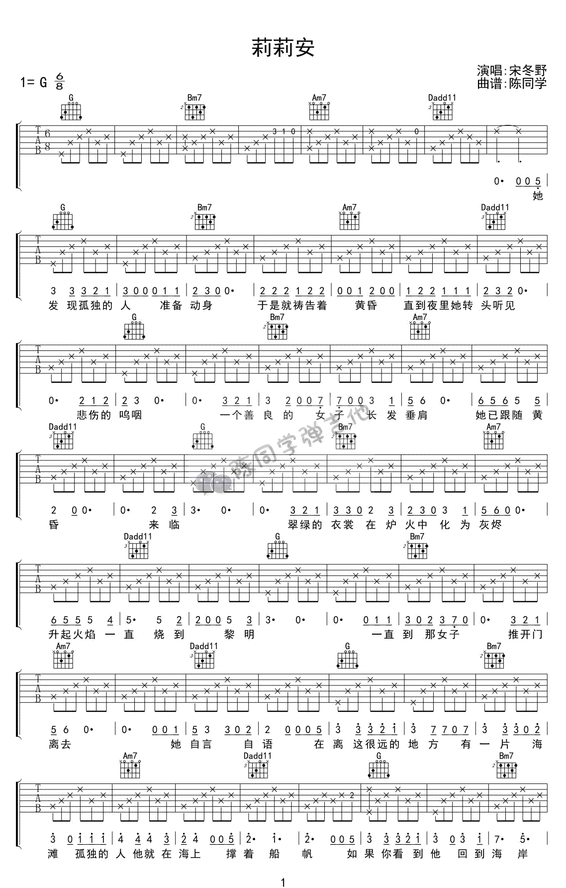曲谱介绍: 吉他谱介绍:莉莉安吉他谱,宋冬野演唱的一首歌曲,6/8拍的节奏,这首歌曲的原调为G调,这里曲谱采用了G调指法进行编配,演唱时可不夹变调夹,曲谱由琴谱网更新上传,共2张高清图片弹唱吉他谱例,来源于@陈同学编配出品。这首歌用木质低沉的嗓音,清新温暖的旋律和耐人回味的原创歌词,温暖并强烈地打动了无数80后的心。 莉莉安吉他弹唱教学