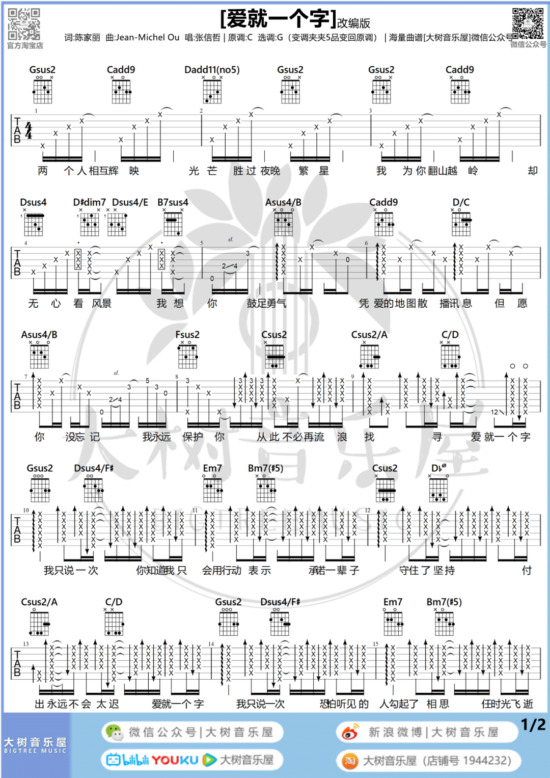 曲谱介绍: 吉他谱介绍:爱就一个字吉他谱,李巍V仔演唱的一首歌曲,4/4拍的节奏,这首歌曲的原调为C调,这里曲谱采用了G调指法进行编配,演唱时夹变调夹5品可回到原调,也可根据个人实际嗓音情况选择。曲谱由琴谱网更新上传,共2张高清图片弹唱吉他谱例,来源于@大树音乐屋编配出品。这首歌原唱为张信哲,网络上有一个V仔改编的版本,使得这首歌重新火了起来。“我为你翻山越岭,却无心看风景;爱就一个字,我只说一次”,曲折缠绵的伤情歌,好像是张信哲的歌曲标志。 爱就一个字吉他弹唱教学