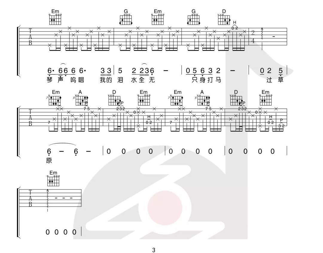 曲谱介绍: 吉他谱介绍:九月吉他谱,周云蓬演唱的一首歌曲,4/4拍的节奏,这首歌曲的原调为#F调,这里曲谱采用了G调指法进行编配,演唱时降半音调弦可回到原调,也可根据个人实际嗓音情况选择不降音或夹几品。曲谱由琴谱网更新上传,共3张高清图片弹唱吉他谱例,来源于@小磊吉他编配出品。海子的名句,老周宽厚富有磁性的声音,直击心底,像一位游牧民族的老人,孤独、苍凉的流浪在草原上,用歌声诉说游牧民族的苦难。 九月吉他弹唱教学