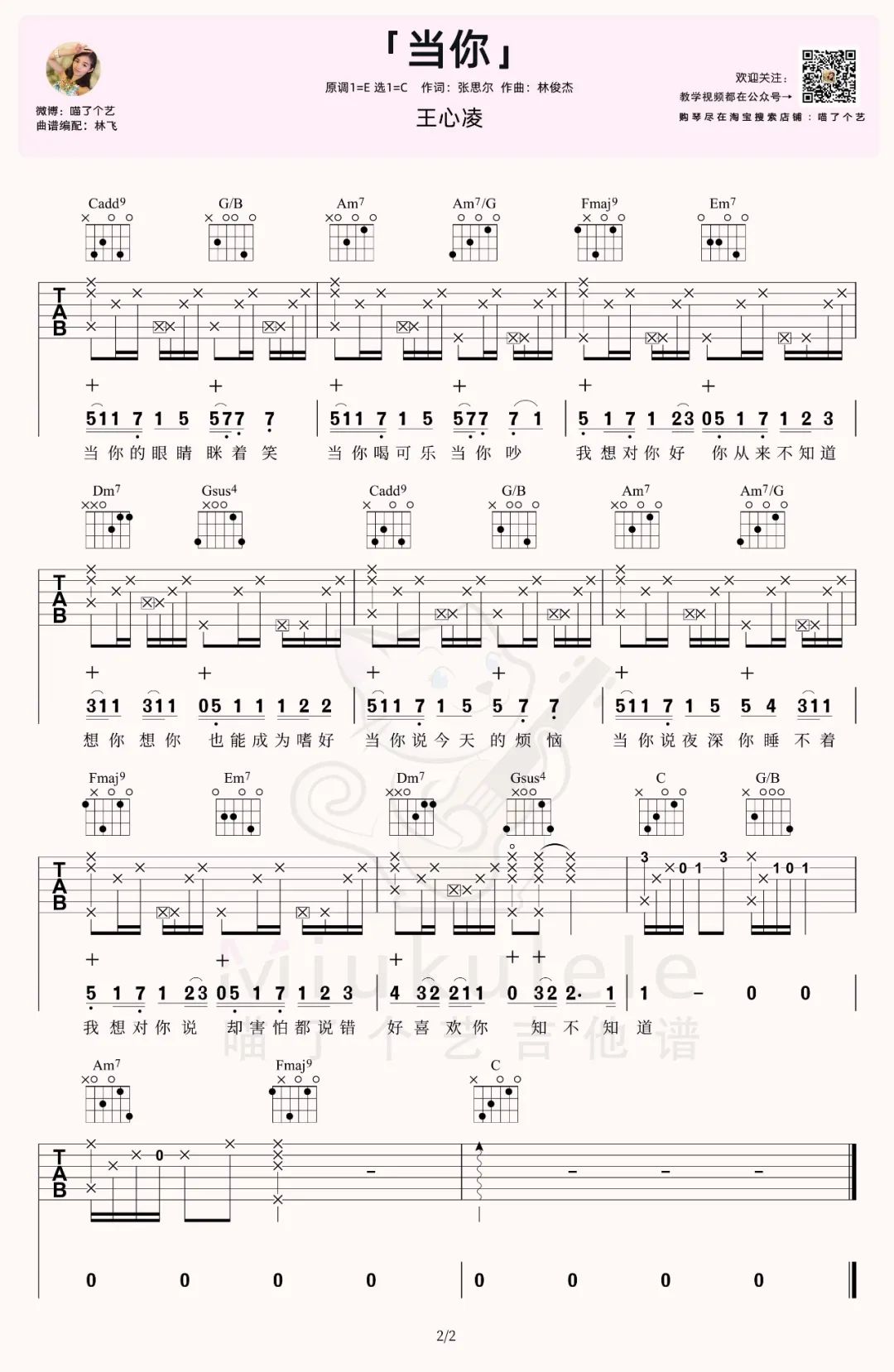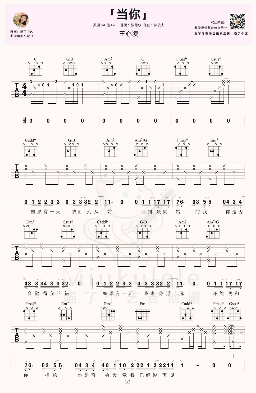 曲谱介绍: 吉他谱介绍:当你吉他谱,林俊杰演唱的一首歌曲,4/4拍的节奏,这首歌曲的原调为E调,这里曲谱采用了C调指法进行编配,演唱时夹变调夹4品可回到原调,也可根据个人实际嗓音情况选择。曲谱由琴谱网更新上传,共2张高清图片弹唱吉他谱例,来源于@喵了个艺编配出品。这首歌是林俊杰写给王心凌的歌,而两人的版本给人的感觉是很不一样的,林俊杰的给人的感觉是失恋,而王心凌的感觉是在热恋中。 当你吉他弹唱教学