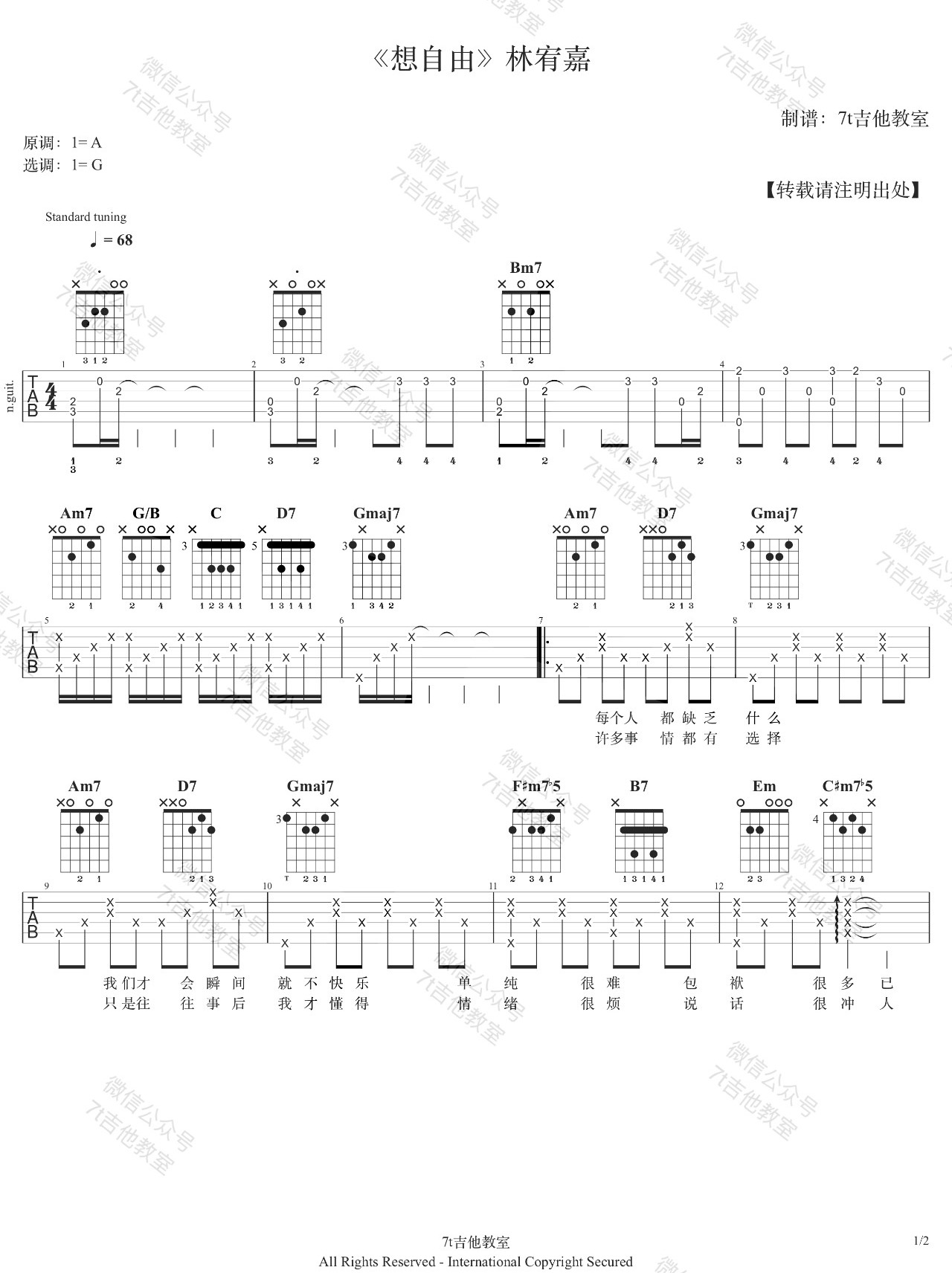 曲谱介绍: 吉他谱介绍:想自由吉他谱,林宥嘉演唱的一首歌曲,4/4拍的节奏,这首歌曲的原调为A调,这里曲谱采用了G调指法进行编配,演唱时夹变调夹2品可回到原调,也可根据个人实际嗓音情况选择。曲谱由琴谱网更新上传,共2张高清图片弹唱吉他谱例,来源于@7T吉他教室编配出品。这首歌是电影《我的灿烂人生》的插曲,林宥嘉希望通过这首歌帮助大家宣泄被困住的情绪,把情绪抒发完以后,找到新的力量,继续快乐的过每一天的美妙生活。 想自由吉他弹唱教学