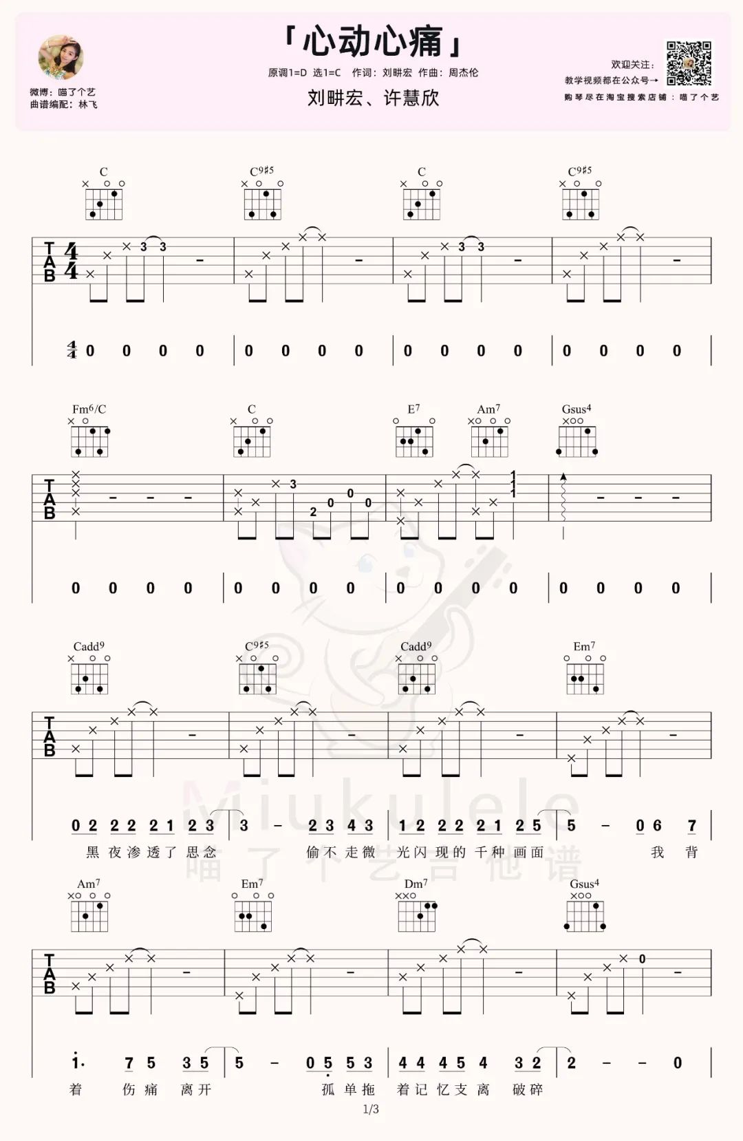 曲谱介绍: 吉他谱介绍:心动心痛吉他谱,刘畊宏演唱的一首歌曲,4/4拍的节奏,这首歌曲的原调为D调,这里曲谱采用了C调指法进行编配,演唱时夹变调夹2品可回到原调,也可根据个人实际嗓音情况选择。曲谱由琴谱网更新上传,共3张高清图片弹唱吉他谱例,来源于@喵了个艺编配出品。这首歌的曲是周杰伦,歌词则来自他的好朋友刘畊宏。话说,两位搭配写歌也是很有默契的,而刘畊宏和许慧欣的唱腔也是非常适合地唱出了两个人在爱情中的辗转挣扎,心动,心痛。 心动心痛吉他弹唱教学