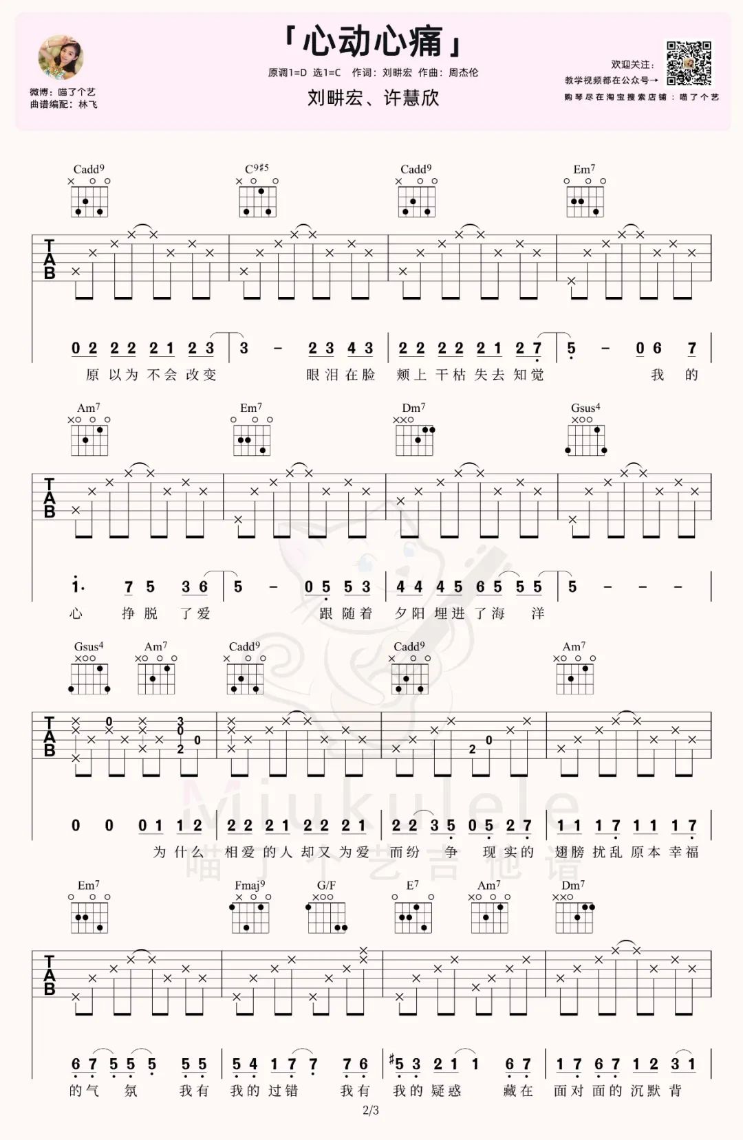 心动心痛吉他谱 - 刘畊宏/许慧欣 - C调吉他弹唱谱 - 原版