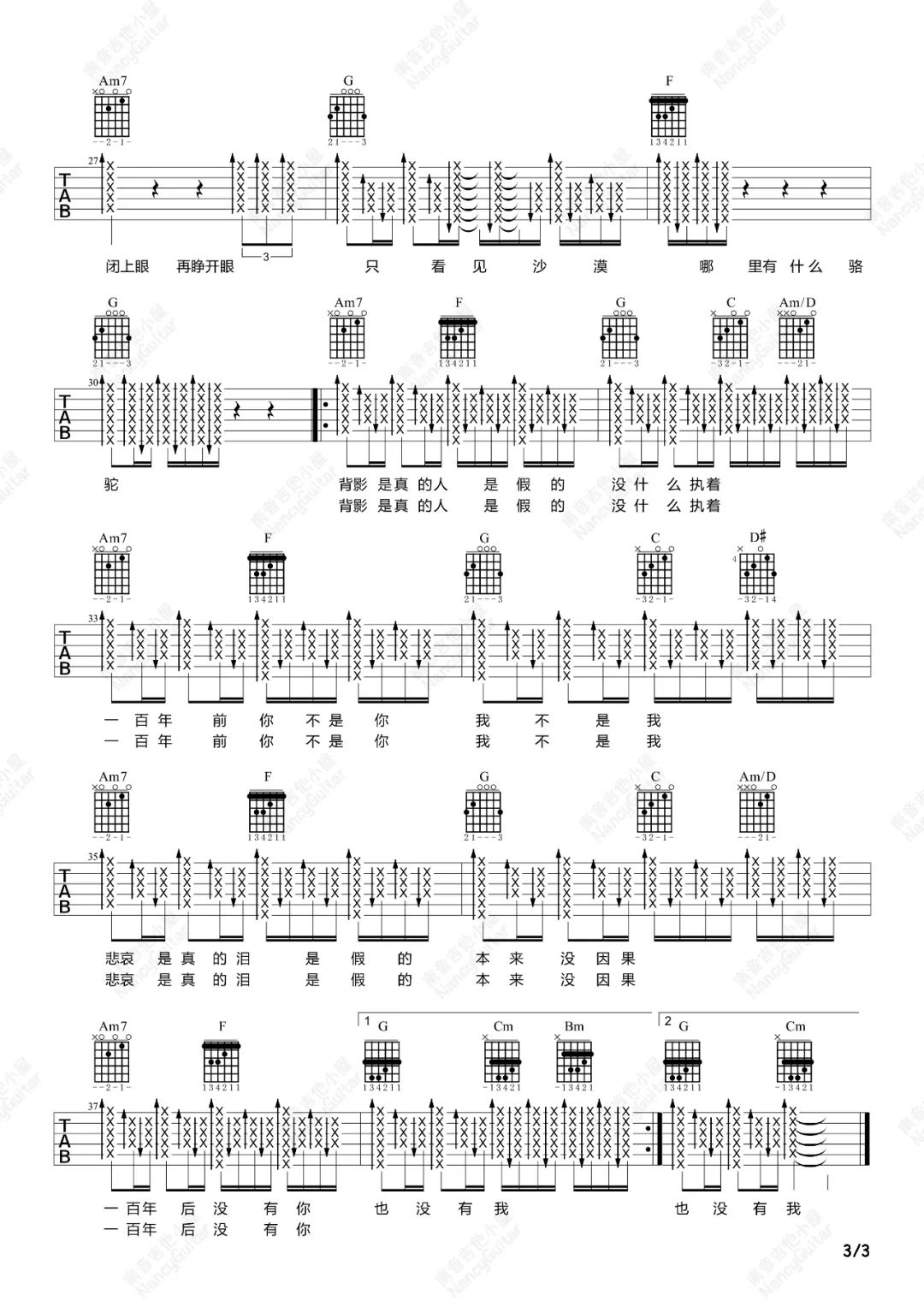 曲谱介绍: 吉他谱介绍:百年孤寂吉他谱,王菲演唱的一首歌曲,4/4拍的节奏,这首歌曲的原调为C调,这里曲谱采用了G调指法进行编配,演唱时夹变调夹5品可回到原调,也可根据个人实际嗓音情况选择。曲谱由琴谱网更新上传,共3张高清图片弹唱吉他谱例,来源于@南音吉他编配出品。这首歌在编配上有着浓郁的中东色彩,歌词中的后一段词写得尤为气势磅礴,非林夕不能作。歌曲与粤语版的《守望麦田》同样精彩,无论是林夕的作词,还是江志仁、陈伟文的作曲,抑或王菲的演唱都是同样的精彩。 百年孤寂吉他弹唱教学