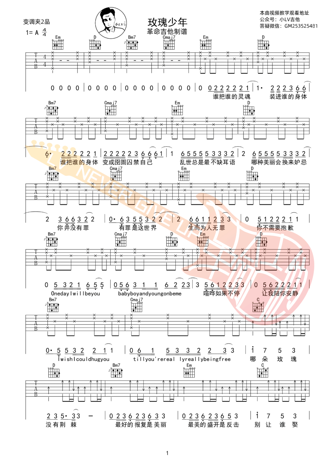 曲谱介绍: 吉他谱介绍:玫瑰少年吉他谱,蔡依林演唱的一首歌曲,4/4拍的节奏,这首歌曲的原调为A调,这里曲谱采用了G调指法进行编配,演唱时夹变调夹2品可回到原调,也可根据个人实际嗓音情况选择。曲谱由琴谱网更新上传,共3张高清图片弹唱吉他谱例,来源于@革命吉他编配出品。这首歌的原唱为蔡依林,五月天也翻唱过这首歌曲,非常好听的一首歌。 玫瑰少年吉他弹唱教学