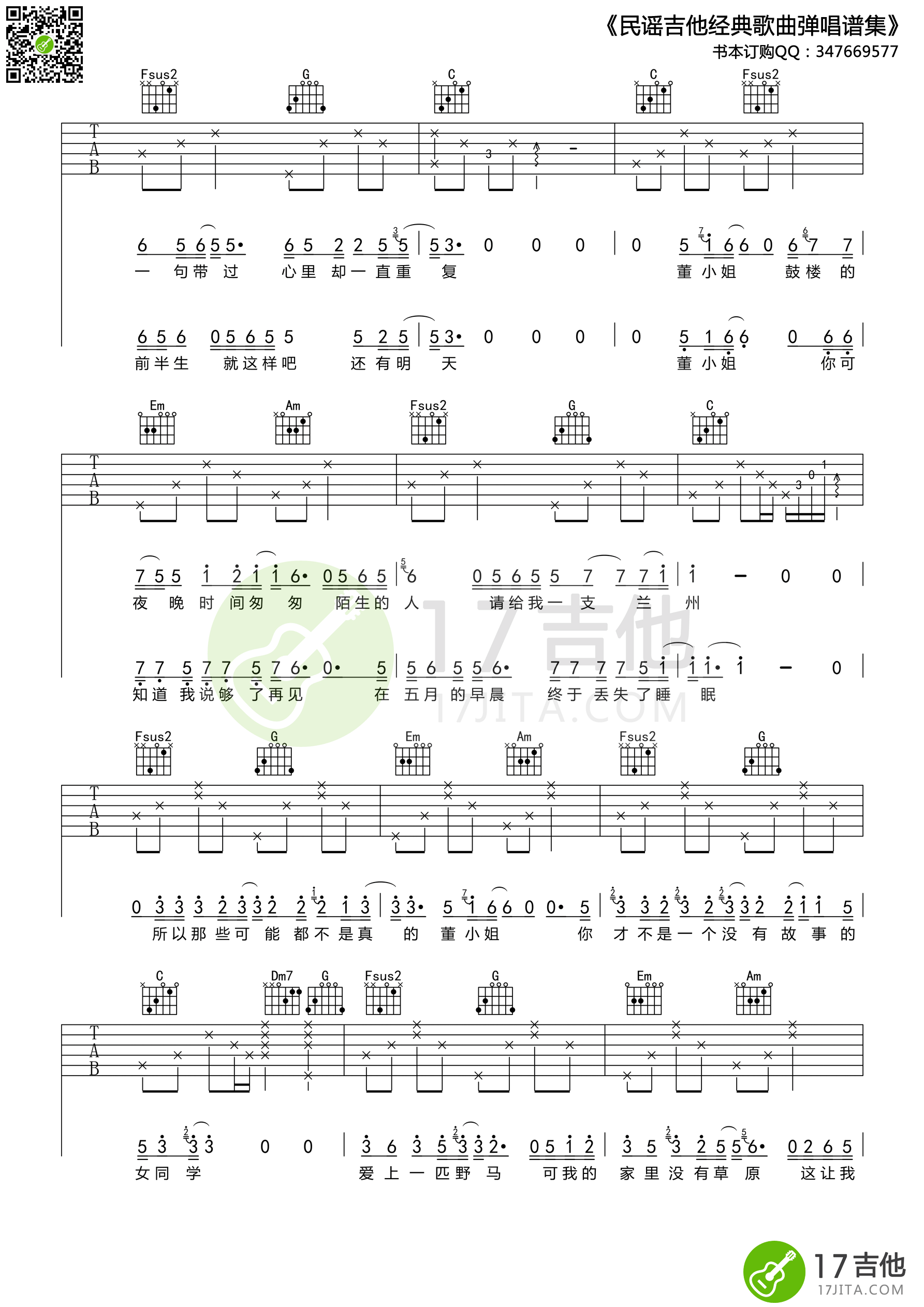 曲谱介绍: 吉他谱介绍:董小姐吉他谱,宋冬野演唱的一首歌曲,4/4拍的节奏,这首歌曲的原调为E调,这里曲谱采用了C调指法进行编配,演唱时夹变调夹4品可回到原调,也可根据个人实际嗓音情况选择。曲谱由琴谱网更新上传,共3张高清图片弹唱吉他谱例,来源于@17吉他编配出品。这版本的谱子难度适中,相较于原版E调,指法简化了很多,难度也小了很多,但是整体效果还是比较接近原版的感觉,想追求原版但又需要简化指法的琴友,可以选择这个版本的吉他谱来练习。