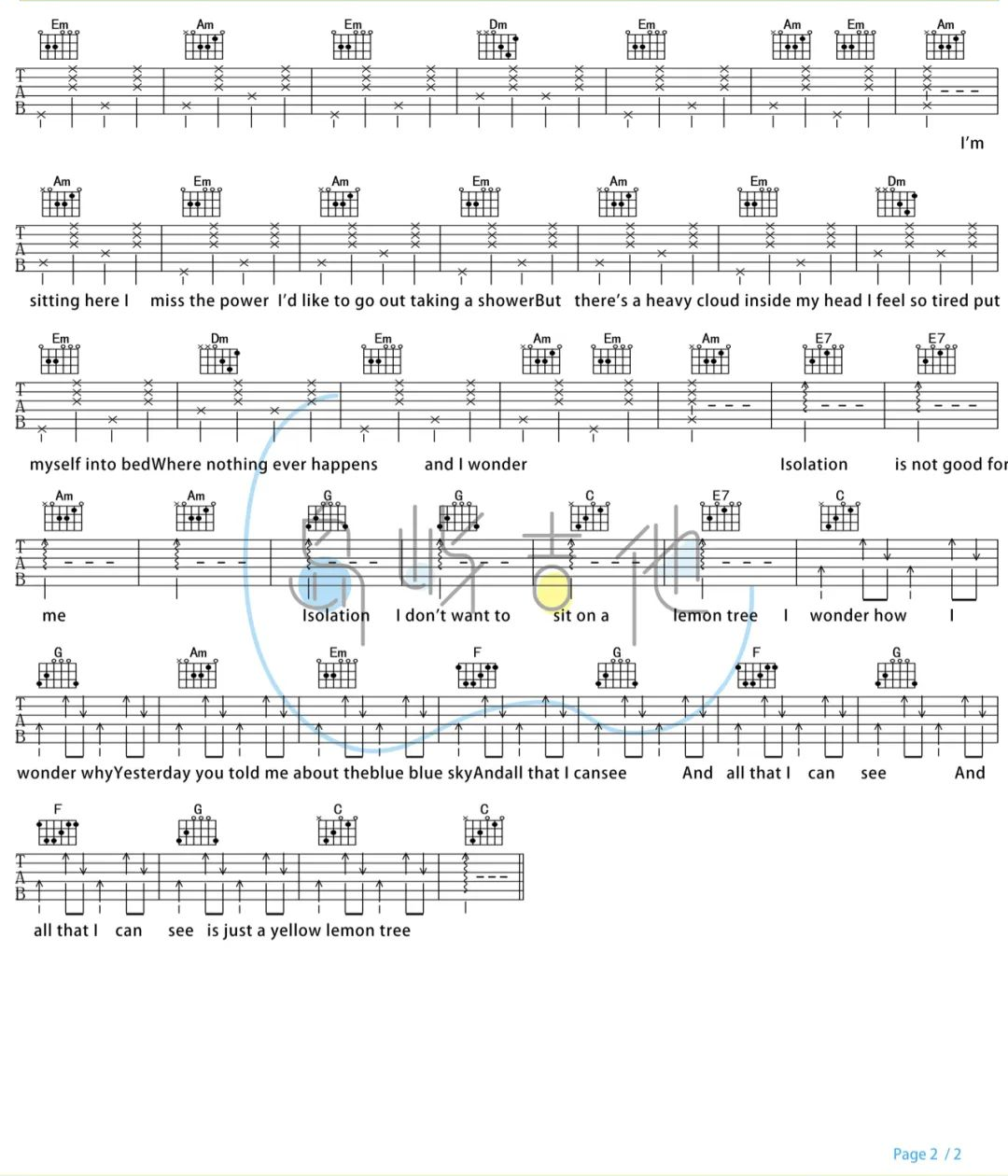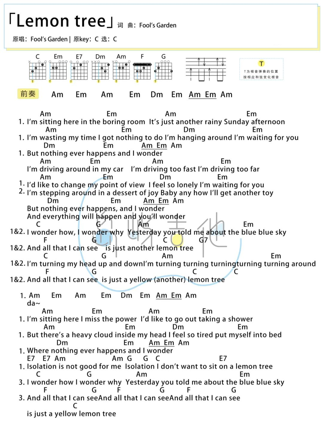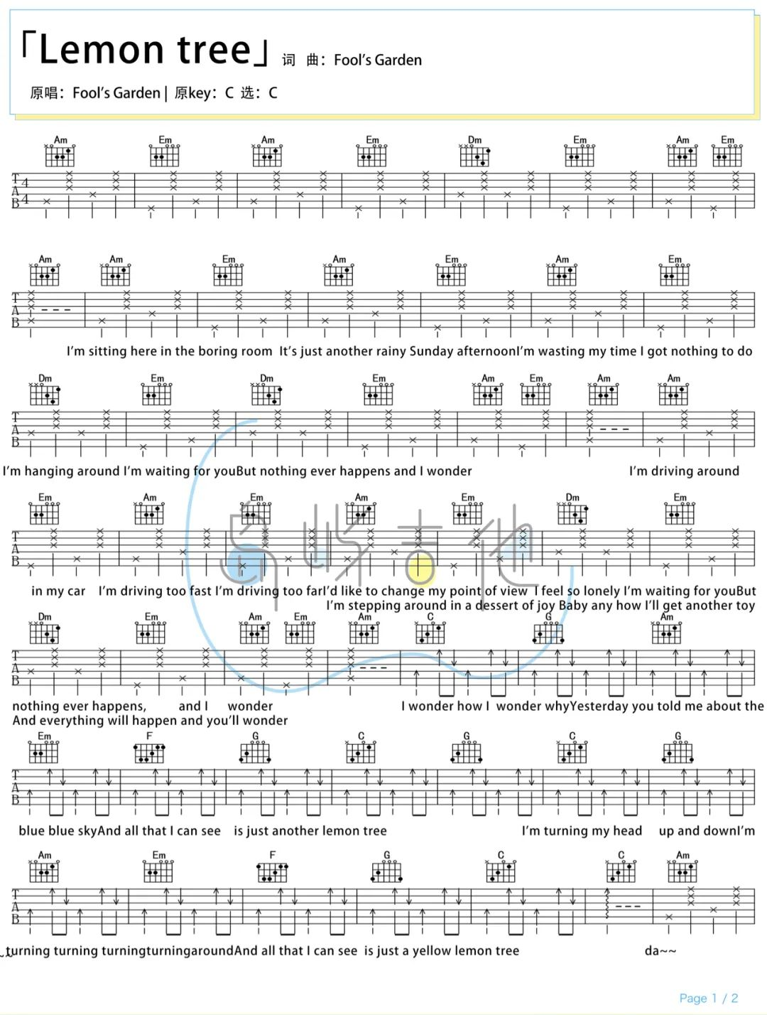 曲谱介绍: Lemon true吉他谱,德国乐队Fool’s Garden(愚人花园)创作并原唱的英文歌曲,也是大家熟知的中文歌曲《柠檬树》,每当听到这首歌的旋律,那种跳跃的调调,总感觉是夏日一股清凉来到我们身边,无忧无虑的忘记了身边的浮躁。 《Lemon true》吉他弹唱谱,选用C调指法,无需使用变调夹,如果觉得较低,可适当的根据嗓音调整变调夹位置,提供了2张六线谱+1张和弦谱,节奏4/4拍,难度:2级简单。