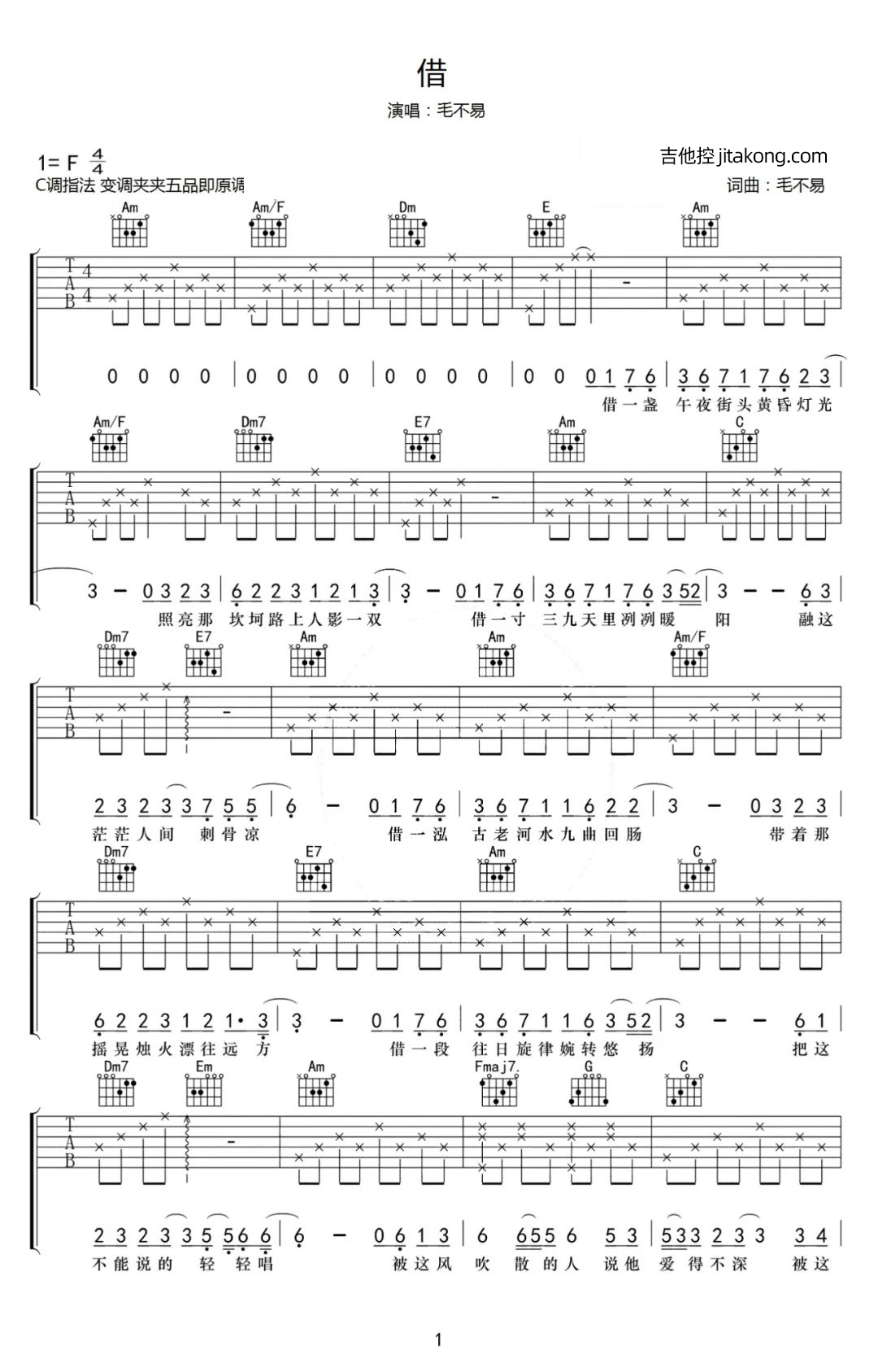 曲谱介绍: 借吉他谱,毛不易创作并演唱的歌曲。 《借》吉他弹唱谱,选用C调指法,原调F调,CAPO可夹5品弹回原调,也可根据自己音域适当降低,节奏4/4拍,难度:2级较简单。