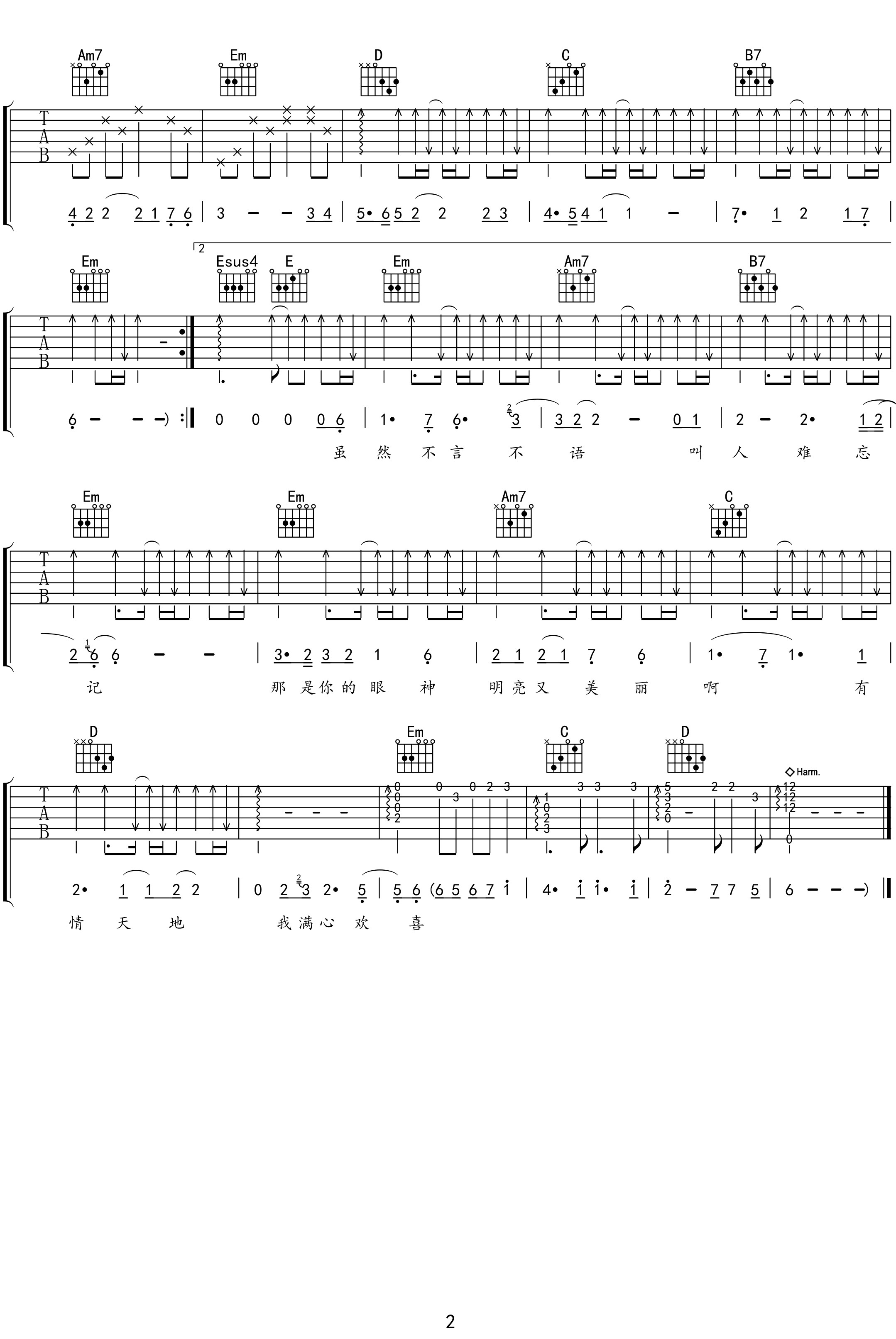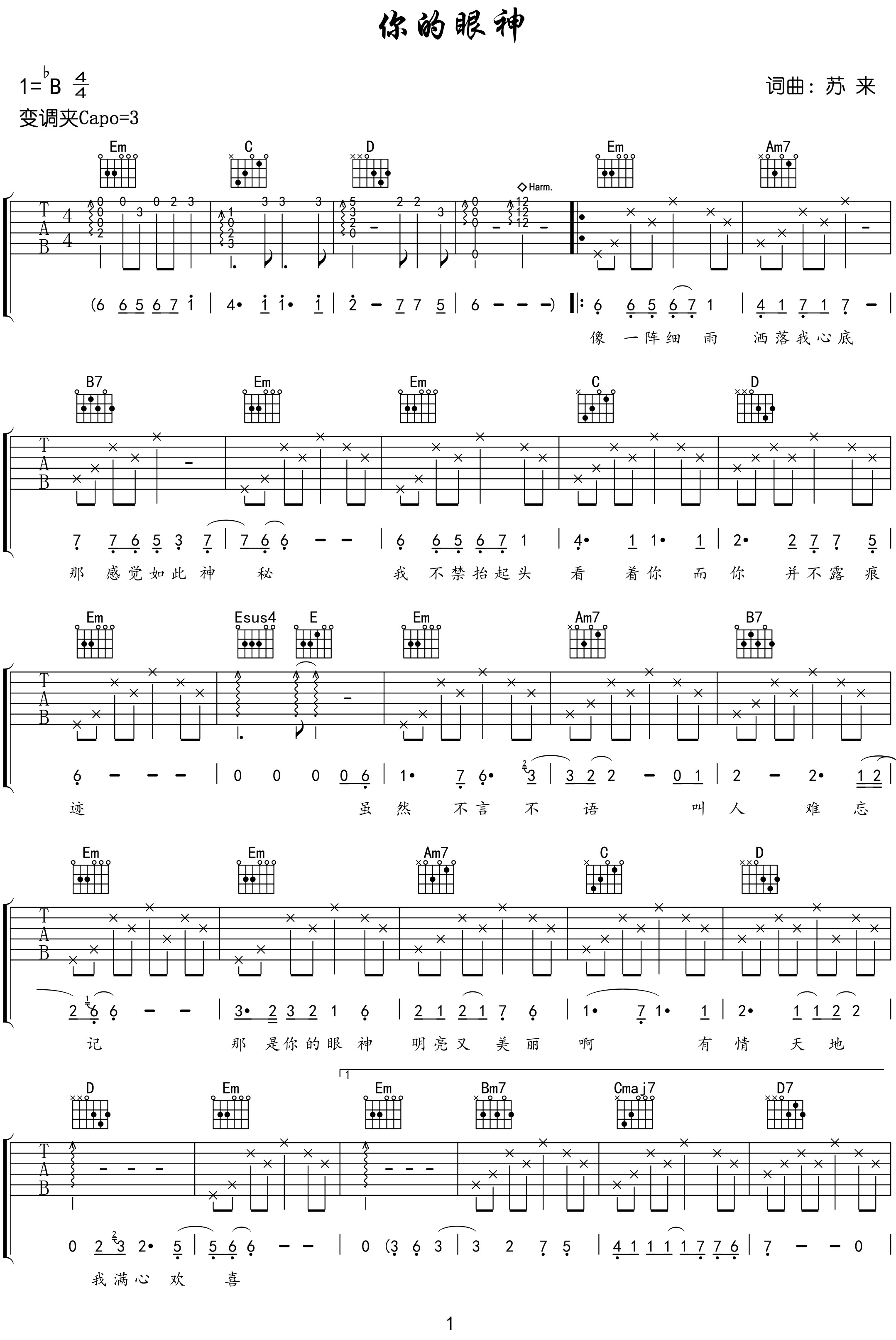 曲谱介绍: 你的眼神吉他谱,蔡琴演唱,苏来作词作曲,她用独特嗓音将一种独特的情调融入到歌曲之中,让人感到无比的舒适,也许这样的心动正如我们生活中一个偶然的眼神,那么深邃且迷人。 《你的眼神》吉他弹唱谱,选用G调指法编配,原调bB,节奏4/4拍,CAPO夹3品弹唱原调,难度:3级较简单。