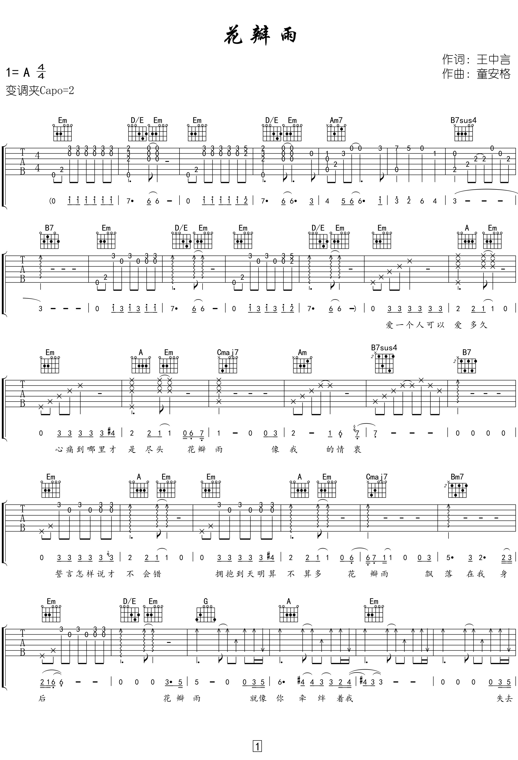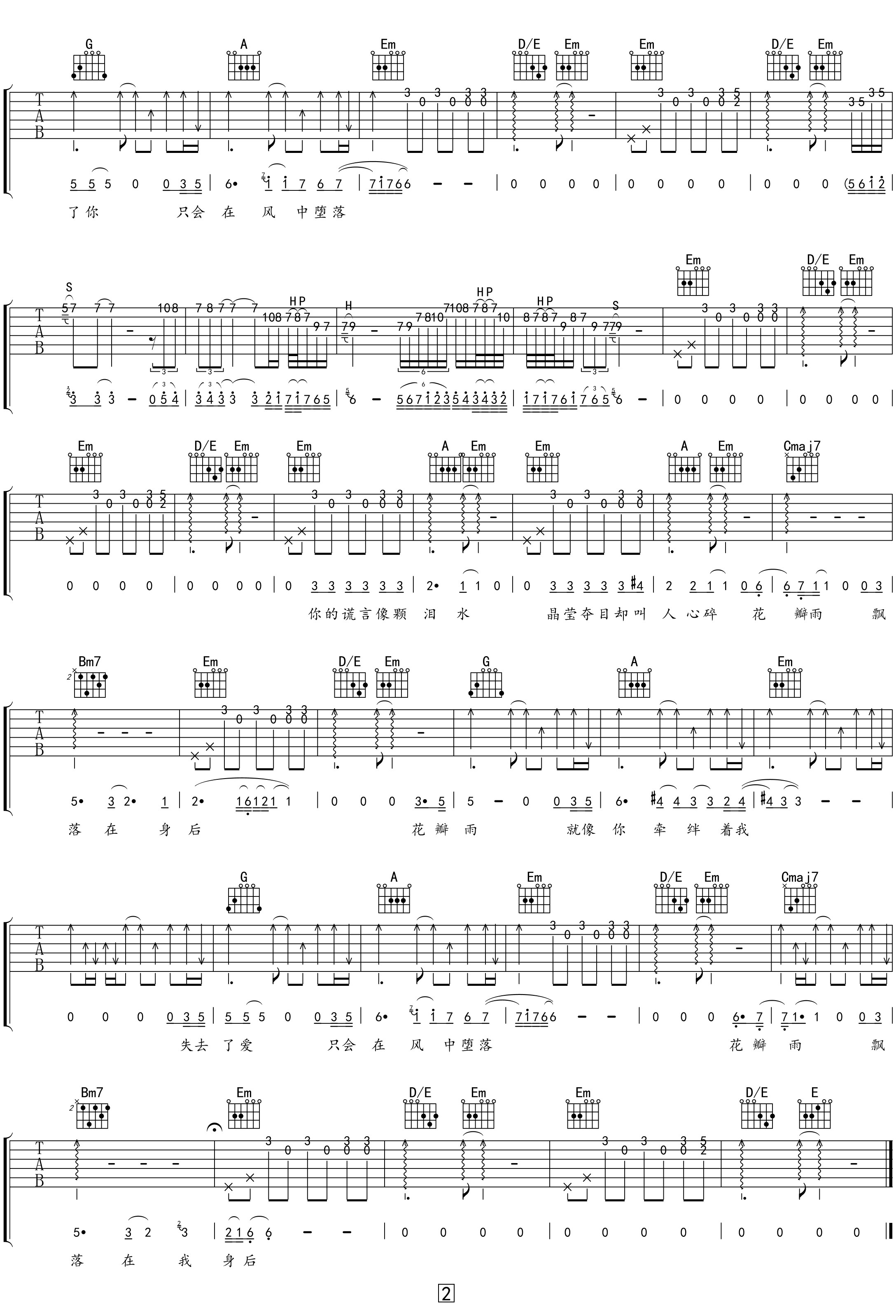 曲谱介绍: 《花瓣雨》吉他弹唱谱,选用G调指法,原调A调,CAPO夹2品弹唱原调,按精编原版编配,含完整前奏/间奏,节奏4/4拍,弹唱难度5级适中。