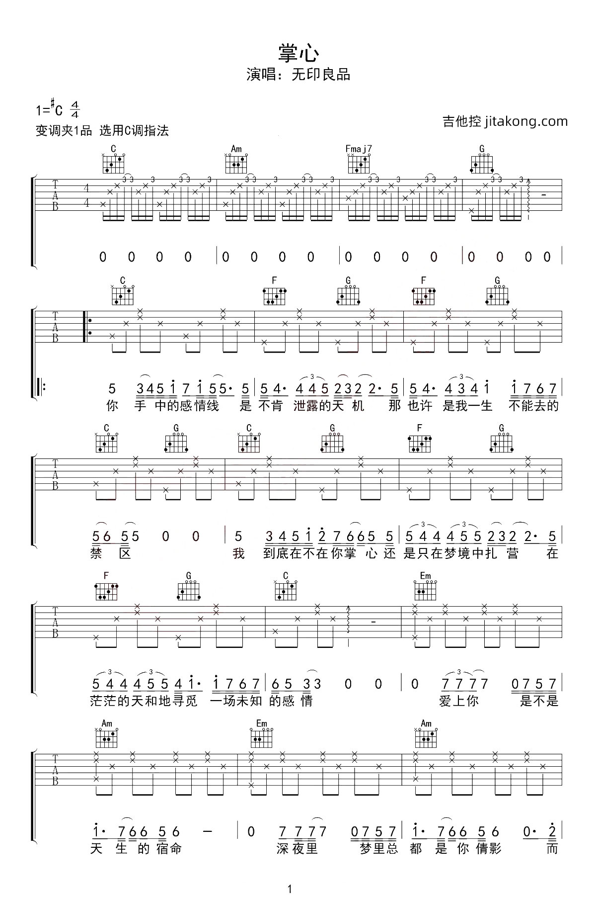 掌心吉他谱 - 无印良品 - C调吉他弹唱谱 - 原版
