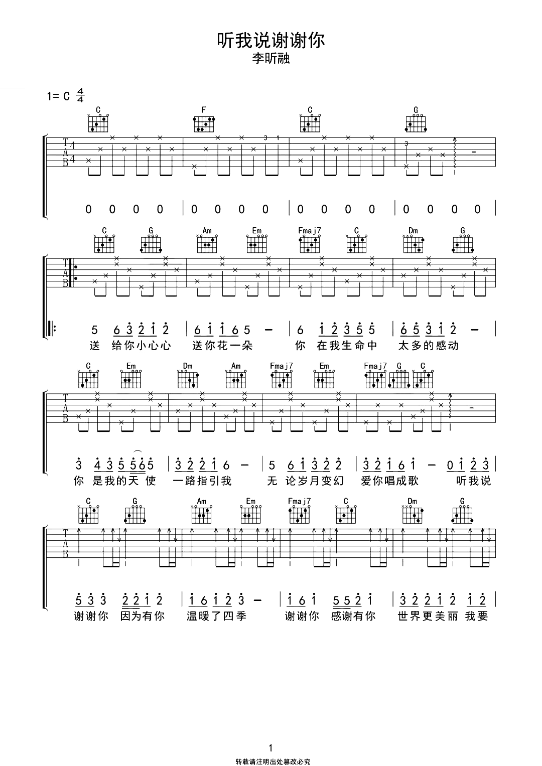 听我说谢谢你吉他谱 - 李昕融 - C调吉他弹唱谱 - 原版
