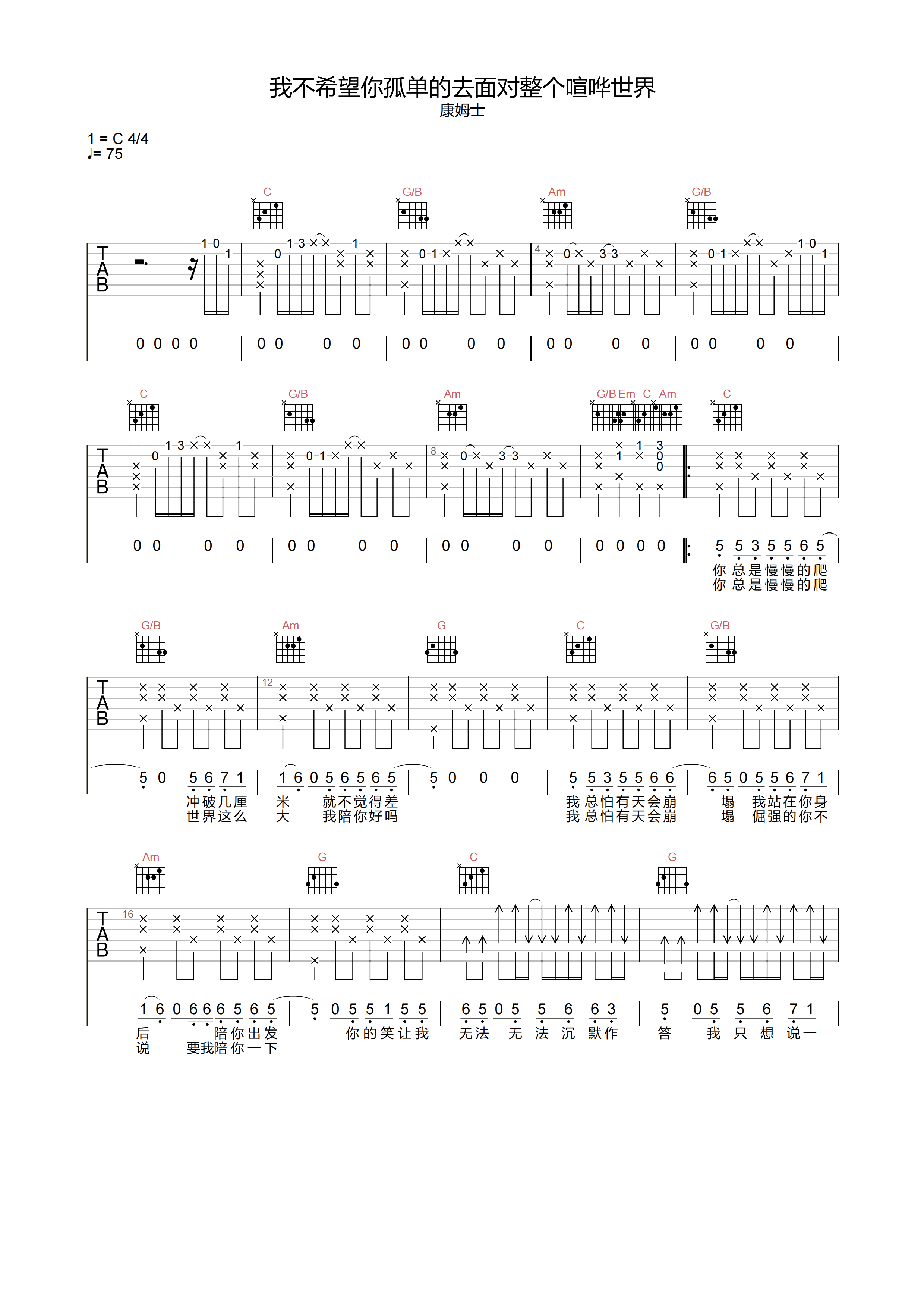 我不希望你孤单的去面对整个喧哗世界吉他谱 - 康姆士 - C调吉他弹唱谱 - 原版