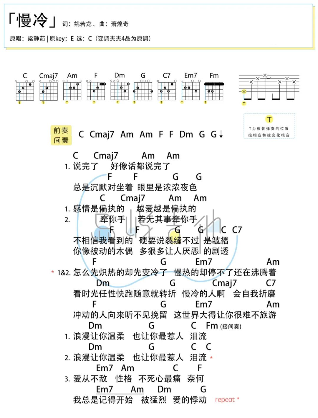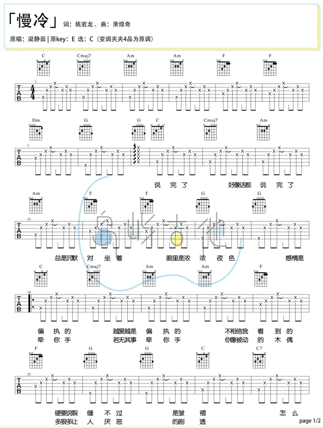 曲谱介绍: 慢冷吉他谱,最近又被大家炒热的一首梁静茹老歌,疗愈般的字句,仿佛在刻画着感情中的一些纠缠悲痛,许多情意由浓转淡,是让我们最不堪,那些哪怕没有说出分手,但已经感觉到彼此失去爱的能力了。 《慢冷》吉他弹唱谱,选用C调指法,原调E调,CAPO夹4品弹唱原调,共有2张六线谱配1张和弦谱,弹唱难度3级较简单。