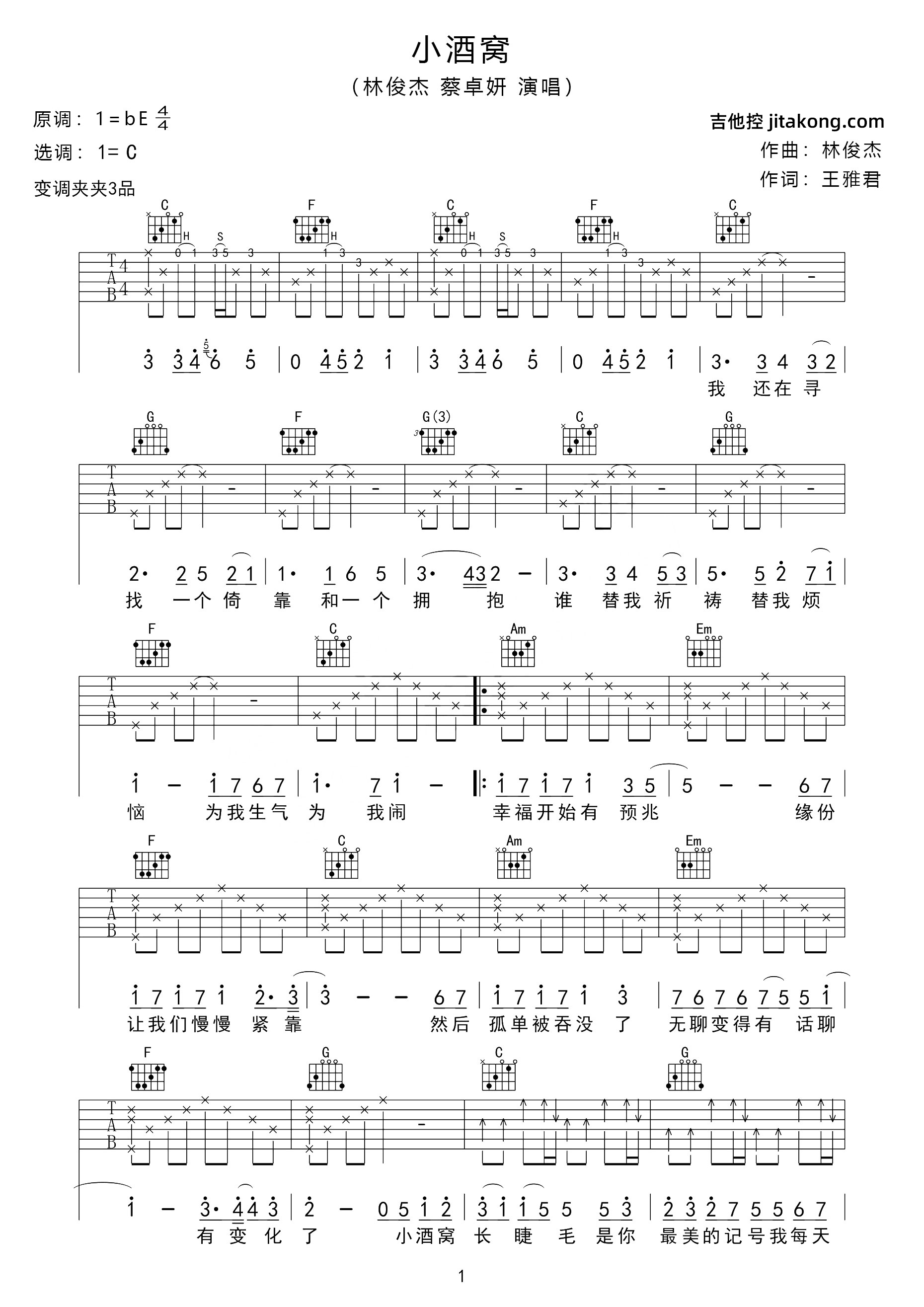 小酒窝吉他谱 - 林俊杰/蔡卓妍 - C调吉他弹唱谱 - 原版