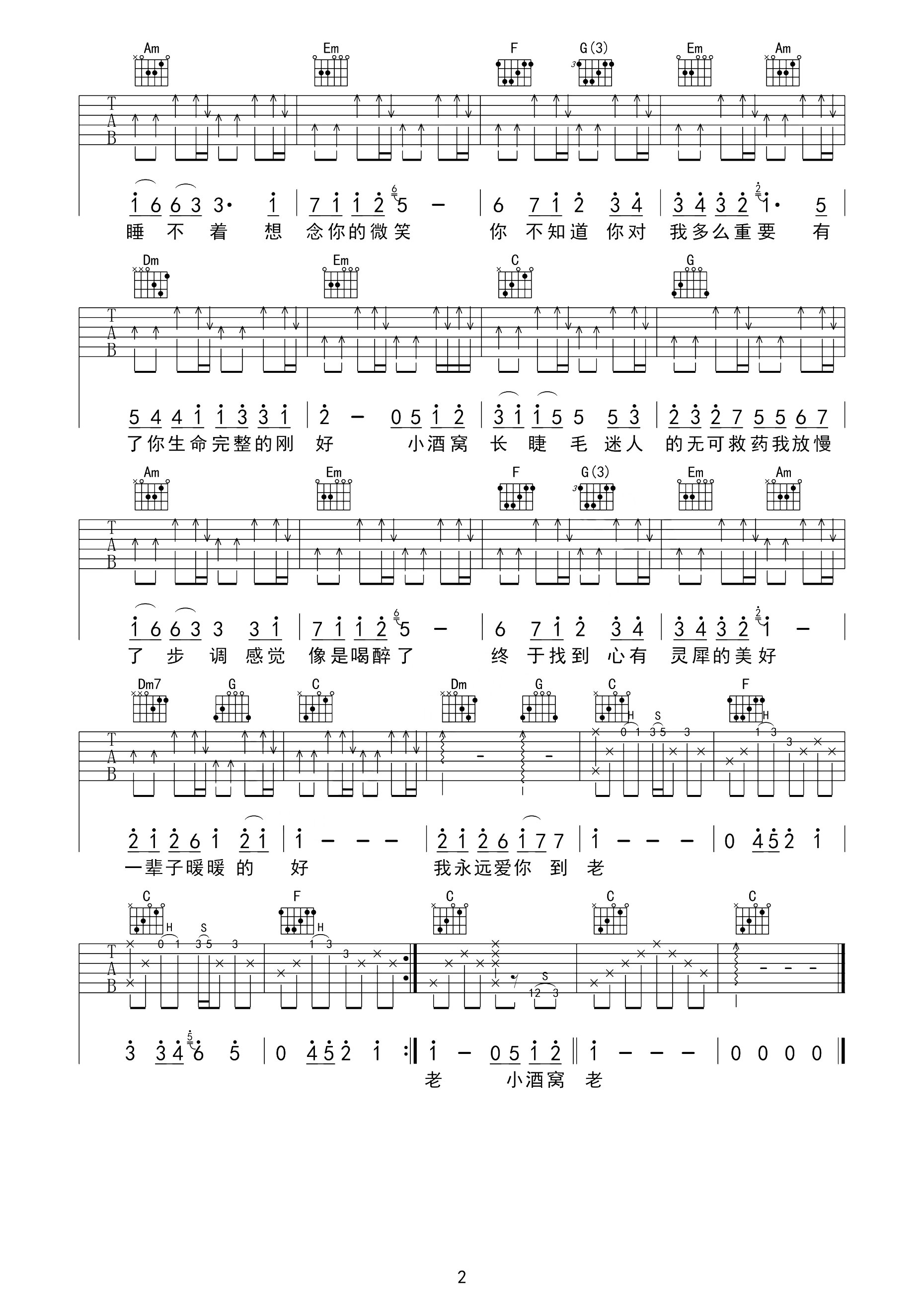 曲谱介绍: 小酒窝吉他谱,林俊杰和蔡卓妍合唱的一首甜美情歌,小酒窝的亲切自然,如此,这首歌是凡世里最真挚贴心的快乐,爱情的感觉往往只有当事人能亲自感受到,但有时候浓度旁人也能闻出别人的幸福,从这里我感受到满怀期待的人在时间的路上缘分慢慢紧靠。 《小酒窝》吉他弹唱谱,选用C调指法,原调bE,节奏4/4拍,CAPO夹3品弹唱原调,含前奏按原版编配,难度3级较简单。