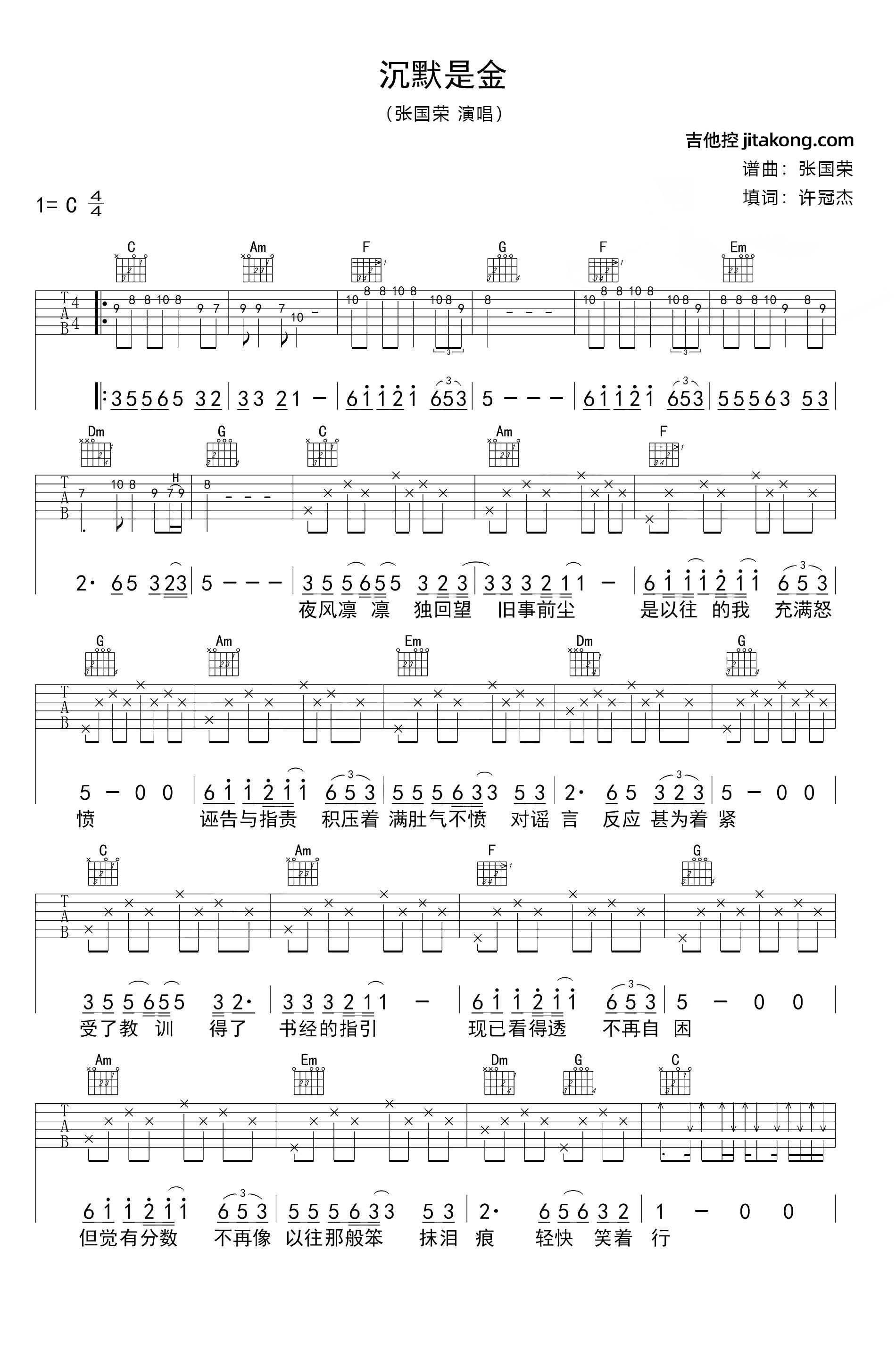曲谱介绍: 沉默是金吉他谱,张国荣演唱的经典粤语歌曲,传统的概念与流行音乐的碰撞,诞生出了这样一个让人深思的歌曲,里面更多的人生哲理,让我们深深地懂得了许多真理,从发自内心的勇敢做自己,懂而不乱胡言,深深的印证了“沉默是金”这句话的精髓。 《沉默是金》吉他弹唱谱,选用C调指法,含前奏按原版编配,标准调音可不用变调夹,也可根据自己嗓音适当调高,节奏4/4拍,弹唱难度:3级较简单。下方附有本曲谱的PDF版本下载。