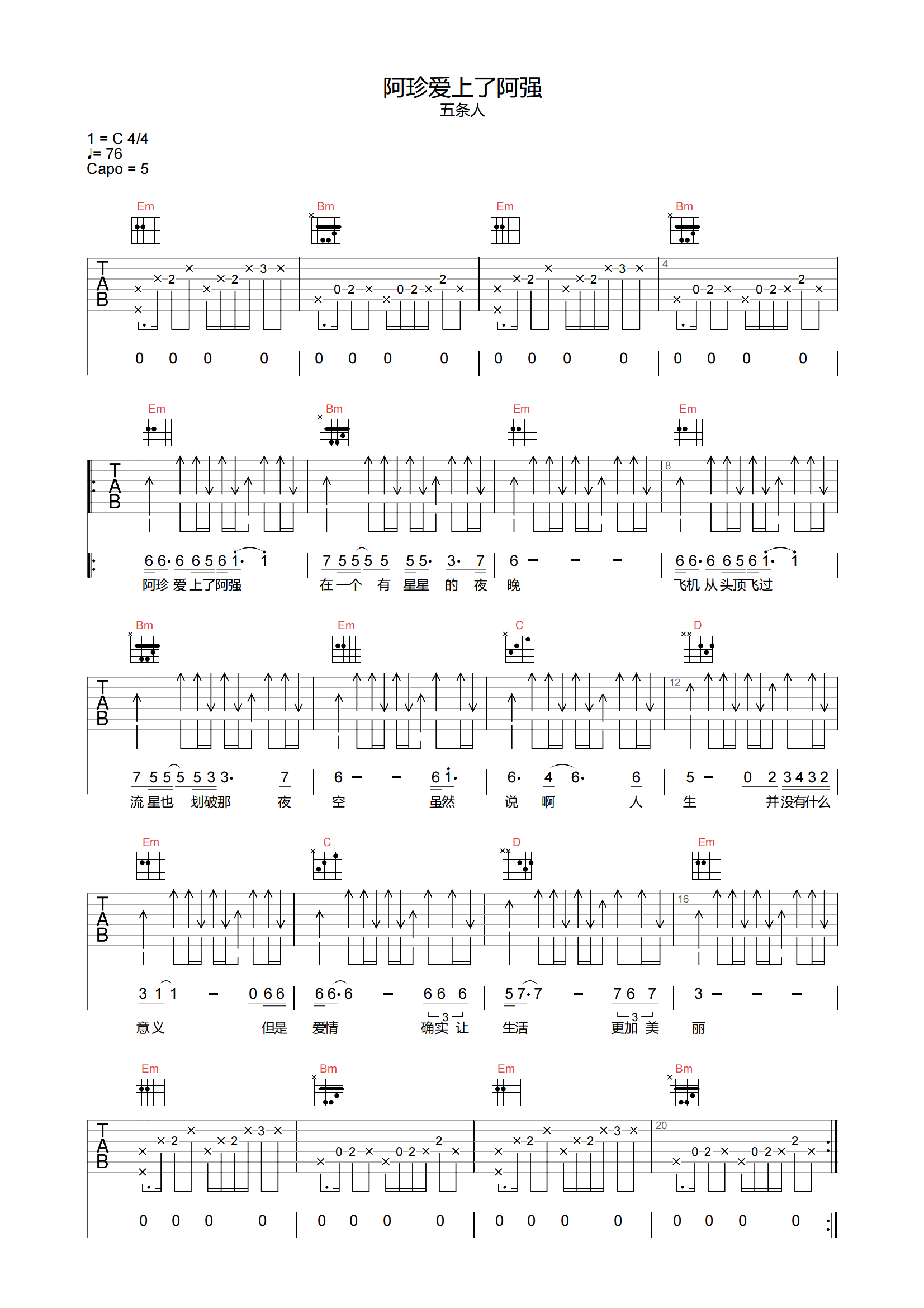 曲谱介绍: 阿珍爱上了阿强吉他谱,五条人演唱,这个看似接地气的歌名是来自《刺客伍六七》的插曲,从而每当音乐响起之时,我们便响起了“伍六七”与“梅花十三”的亲密之事。 《阿珍爱上了阿强》吉他弹唱谱,选用C调指法,原调F调,CAPO夹5品弹唱原调,速度控制在76拍每分钟,节奏4/4拍,难度3级较简单。
