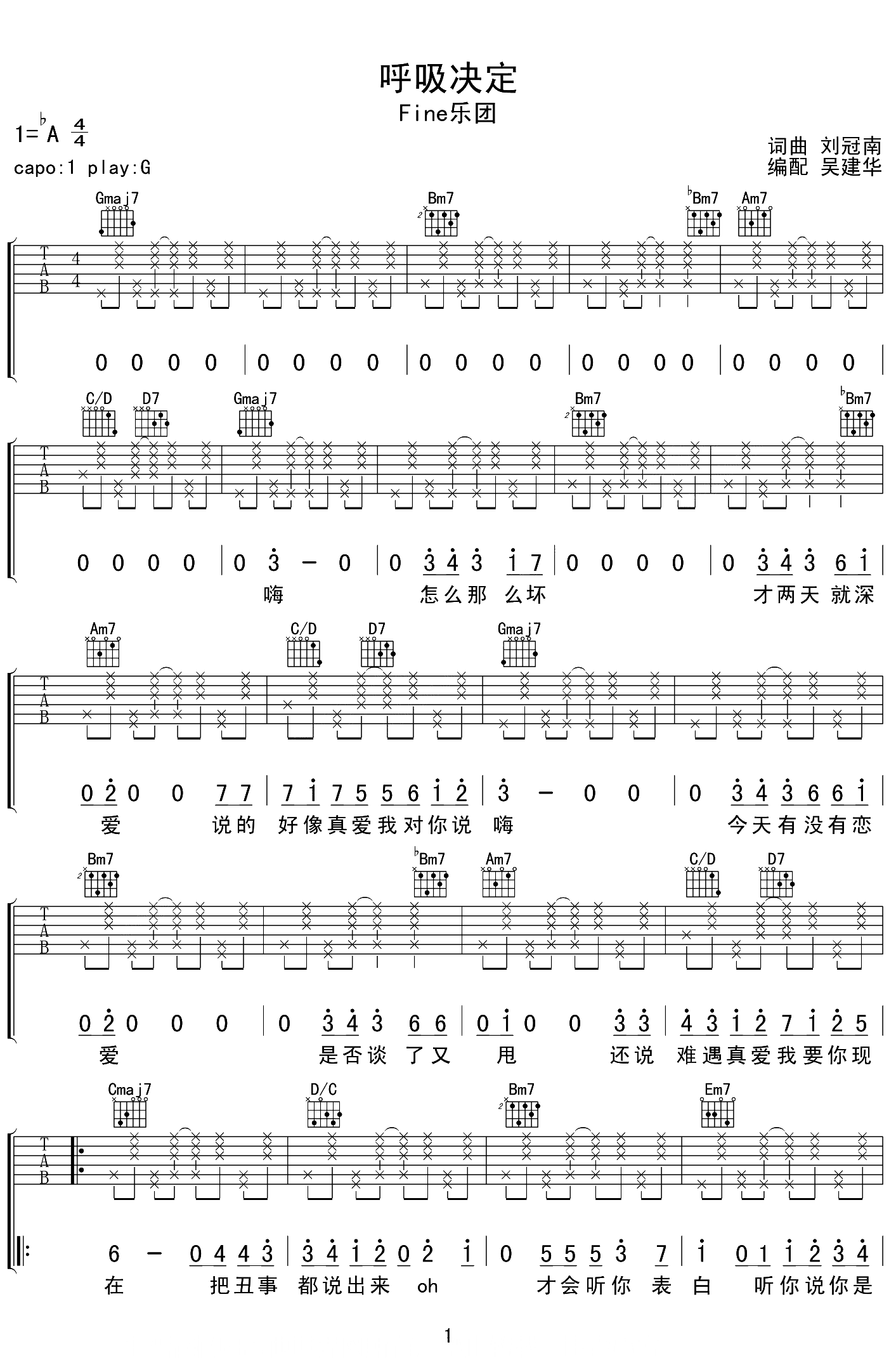 呼吸决定吉他谱 - Fine乐团 - G调吉他弹唱谱 - 原版