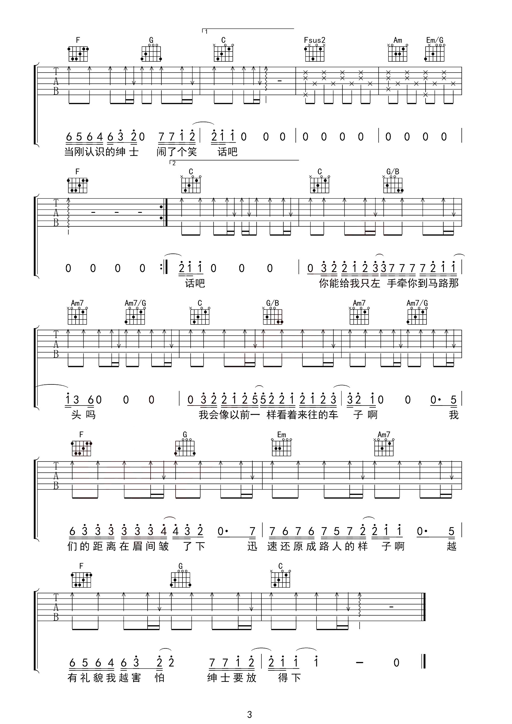 曲谱介绍: 绅士吉他谱,薛之谦演唱的歌曲,陌生且礼貌的只言片语,对应的是曾经的“我和你”,一切的举动显得熟悉又有距离,这样的感觉又“绅士”得让人着迷,而过去的终究已过去,不会再来临。 《绅士》吉他弹唱谱,选用C调指法,原调#C,CAPO夹1品弹唱原调,节奏4/4拍,弹唱难度2级简单。