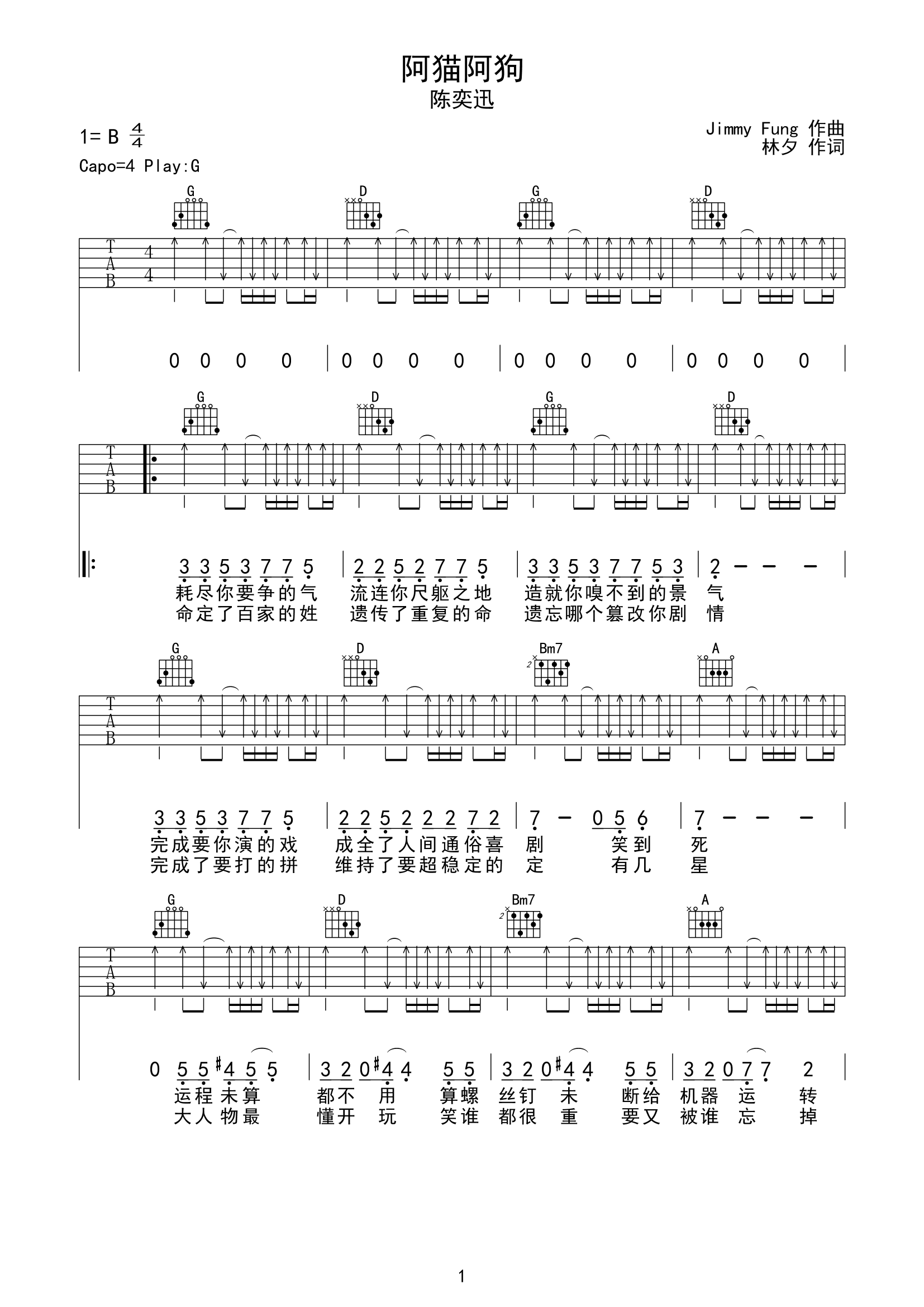 曲谱介绍: 阿猫阿狗吉他谱,陈奕迅演唱的歌曲,由林夕作词,JimmyFung作曲,歌词内容直接而振奋。 《阿猫阿狗》吉他弹唱谱,选用G调指法,原调B调,CAPO夹4品可弹唱原调,全曲扫弦节奏贯穿,节奏4/4拍,难度3级较简单。