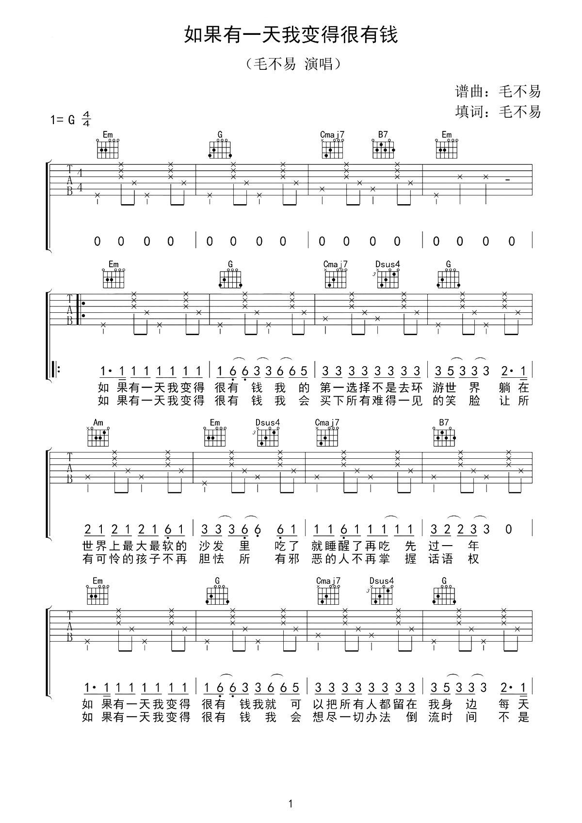 如果有一天我变得很有钱吉他谱 - 毛不易 - G调吉他弹唱谱 - 原版