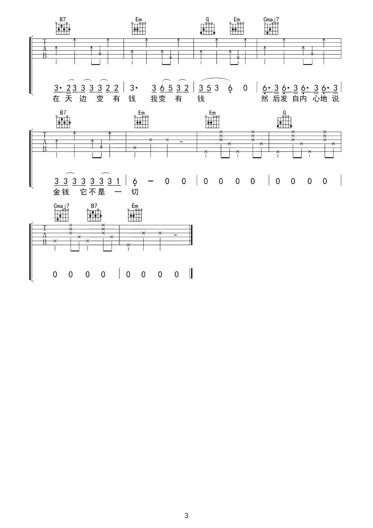 曲谱介绍: 如果有一天我变得很有钱吉他谱,毛不易与MC天佑作曲并演唱的一首歌曲,毛不易在歌中展示了从未演示的美声唱腔以及和声,两人将”变有钱”的呼唤亦正式亦诙谐的呈现。 《如果有一天我变得很有钱》吉他弹唱谱,选用G调指法,原调编配,共有3张高清图片谱例,节奏4/4拍,难度3级较简单。