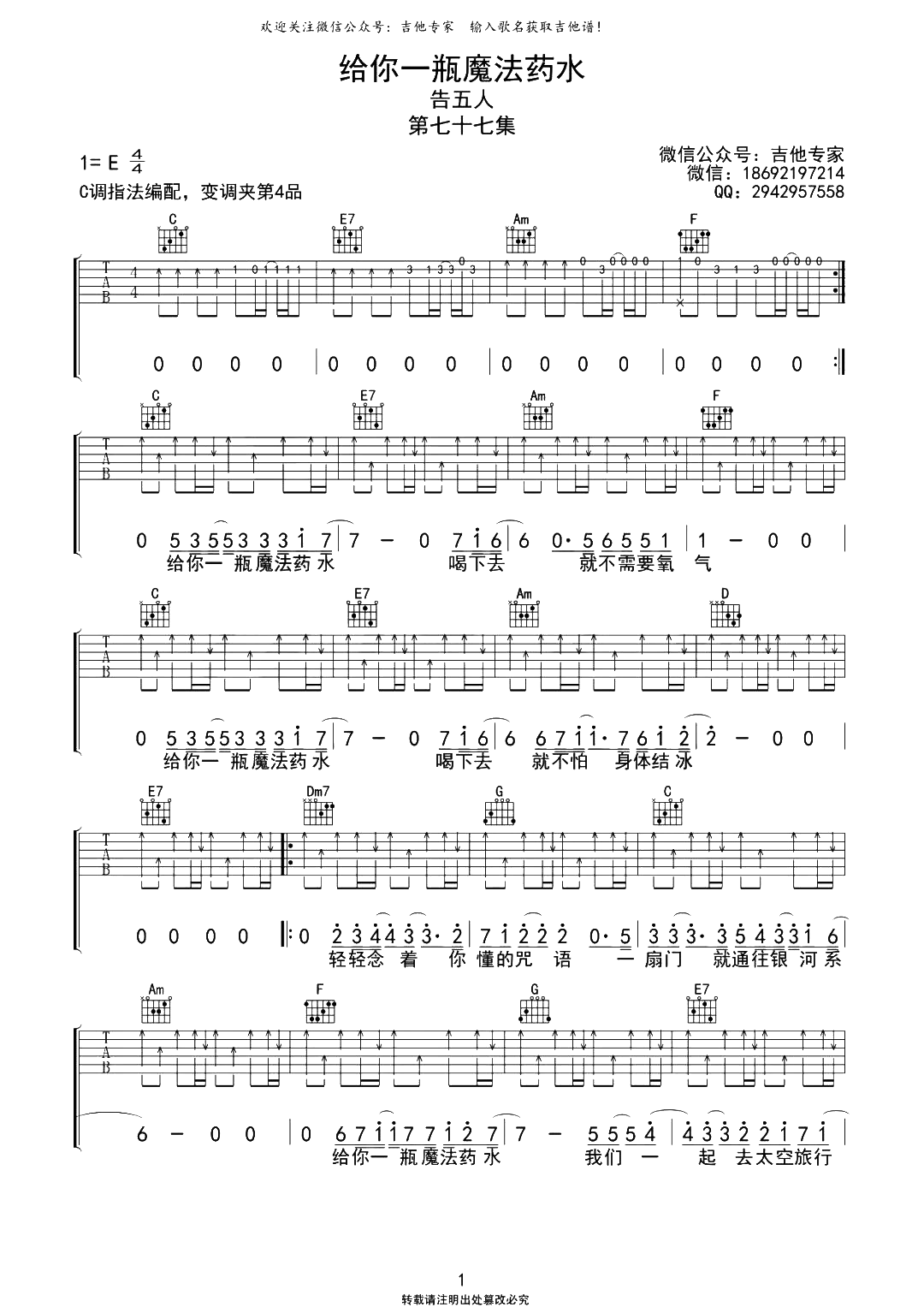 曲谱介绍: 给你一瓶魔法药水吉他谱,告五人演唱的歌曲,最近在网络中爆火,轻快雀跃又带点甜的旋律歌词,不经意就容易带动自己的情绪高点,副歌旋律片段“宇宙的有趣,我才不在意,我在意的是你牵我的手而乱跳的心”似乎成了这段时间反复洗脑的片段,传唱度极高。 《给你一瓶魔法药水》吉他弹唱谱,选用C调指法,原调E调,CAPO夹4品弹唱原调,含完整前奏按原版编配,难度3级较简单。