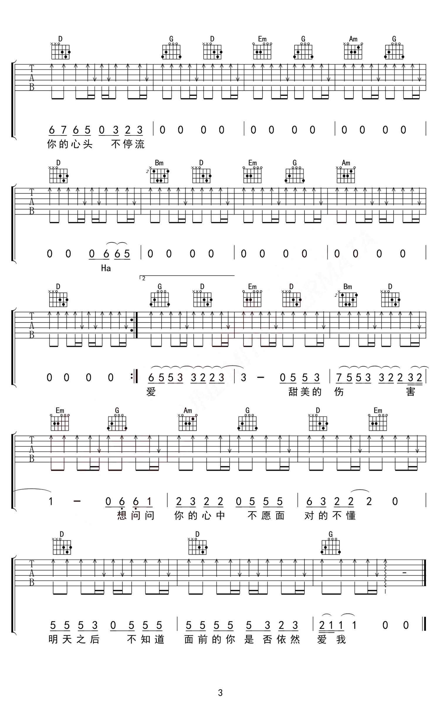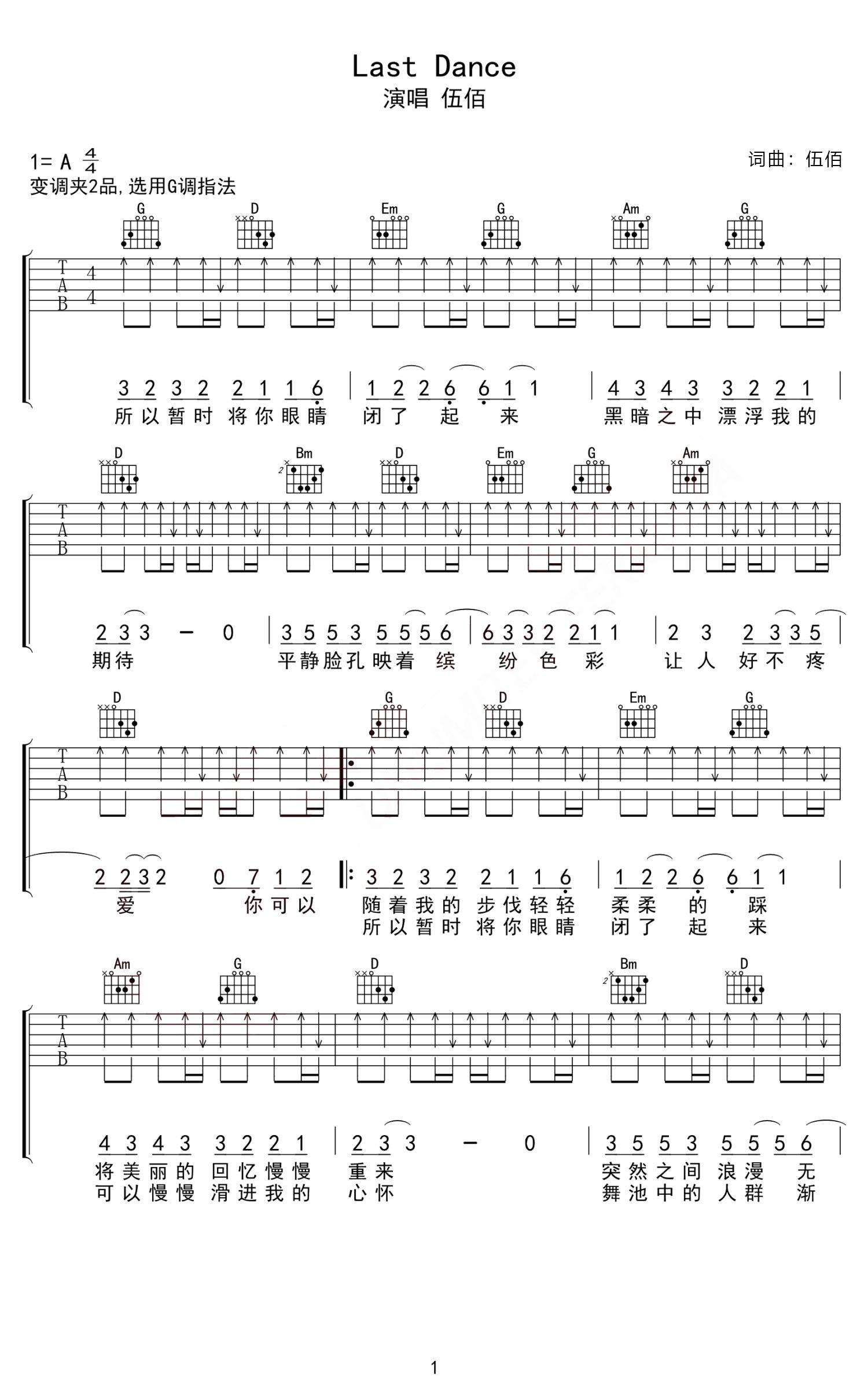 曲谱介绍: Last Dance吉他谱,伍佰演唱,同时也是台湾穿越偶像剧《想见你》插曲,简单不复杂的唱法,却纯粹而洒脱,我们听到这首歌的旋律的时候,也许不是过往的回忆,更多的是蒙上双眼,关于影视剧的画面片段。 《Last Dance》吉他弹唱谱,选用G调指法编配,原调A调,CAPO夹2品弹唱原调,扫弦节奏贯穿全曲,没有复杂的节奏,比较规律,难度3级较简单。