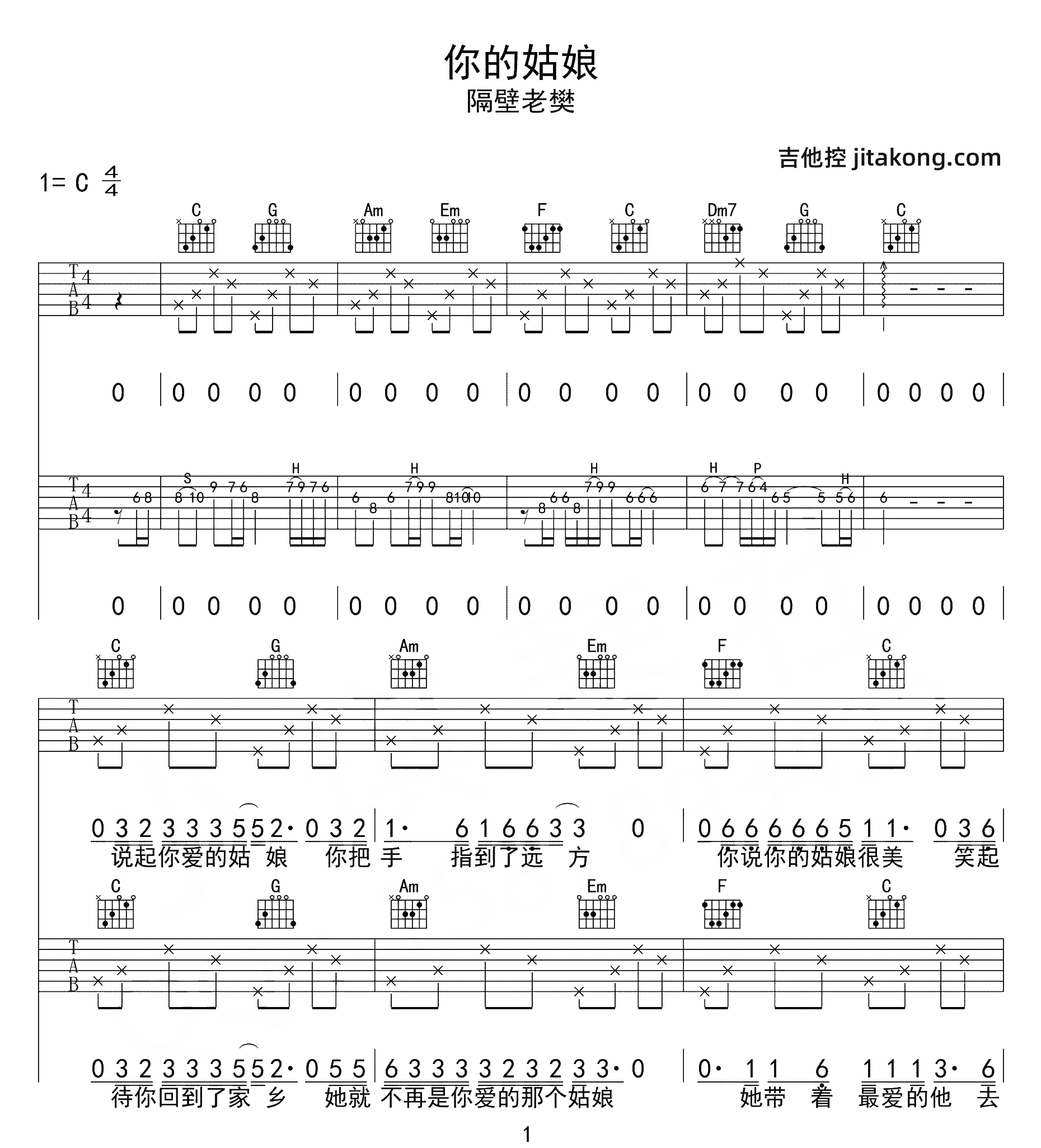 你的姑娘吉他谱 - 隔壁老樊 - C调吉他弹唱谱 - 原版
