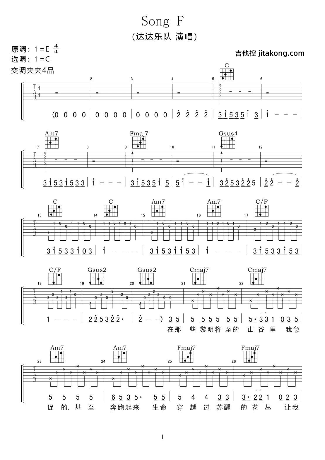 曲谱介绍: Song F吉他谱,达达乐队原创并演唱的歌曲,他们也在《乐队的夏天2》中演唱过live版本,轻松的旋律,仿佛如叙事般的推进,没有复杂的词藻,也许就想吐着心声,让我们听听小曲。 《Song F》吉他弹唱谱,选用C调指法,原调E调,CAPO夹4品可弹唱原调,本谱篇幅较长,共包含了9张图片谱例,下方为大家提供了PDF版本下载,弹唱难度3级较简单。