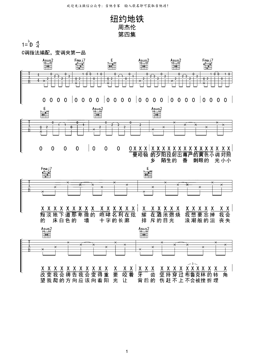 曲谱介绍: 纽约地铁吉他谱,周杰伦18年前创作并演唱的“新歌”,主要是由于周杰伦此前并没有公开发行这首歌曲。但是令歌迷惊讶的是,这首歌曲完成度竟然如此之高,让我们在这样莫名的情况下,来品味杰伦熟悉的配方吧。 《纽约地铁》吉他弹唱谱,选用C调指法,原调bD调,CAPO夹1品弹唱原调,节奏4/4拍,含前奏的原版,弹唱难度4级较简单,本页下方附曲谱的PDF版本,供琴友们下载。
