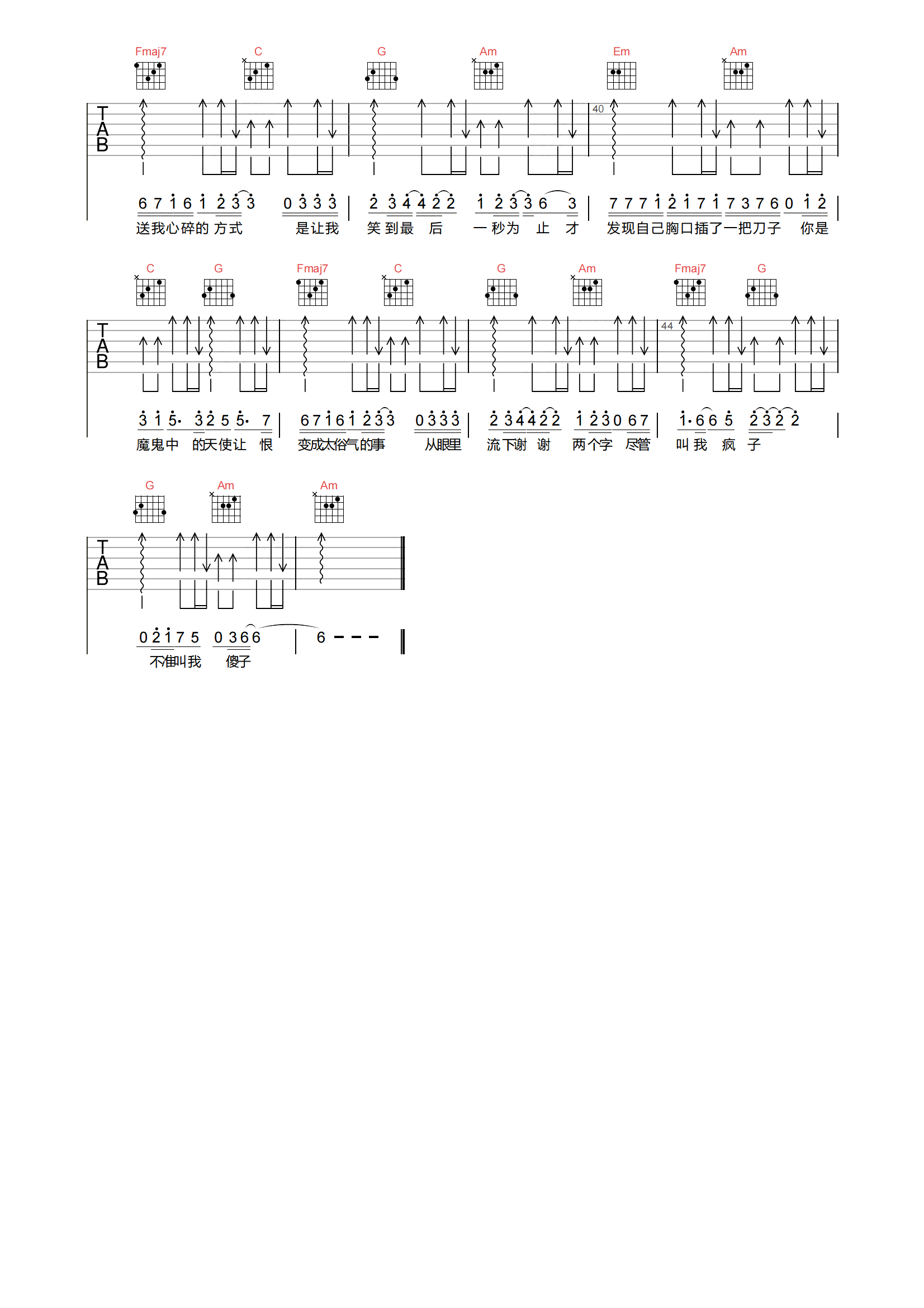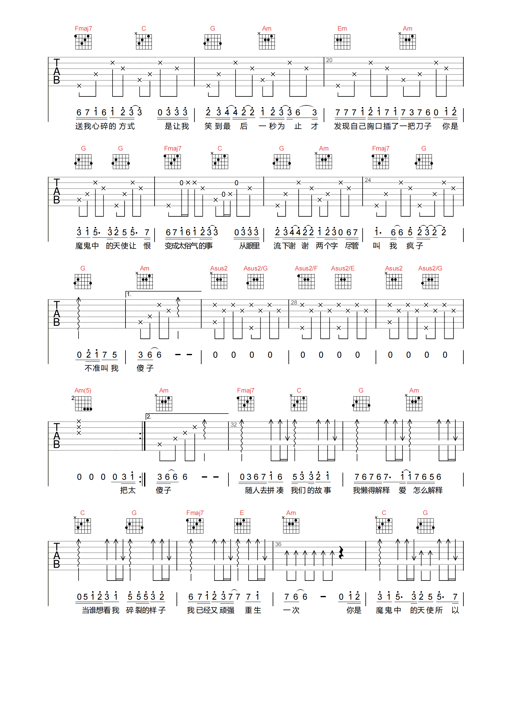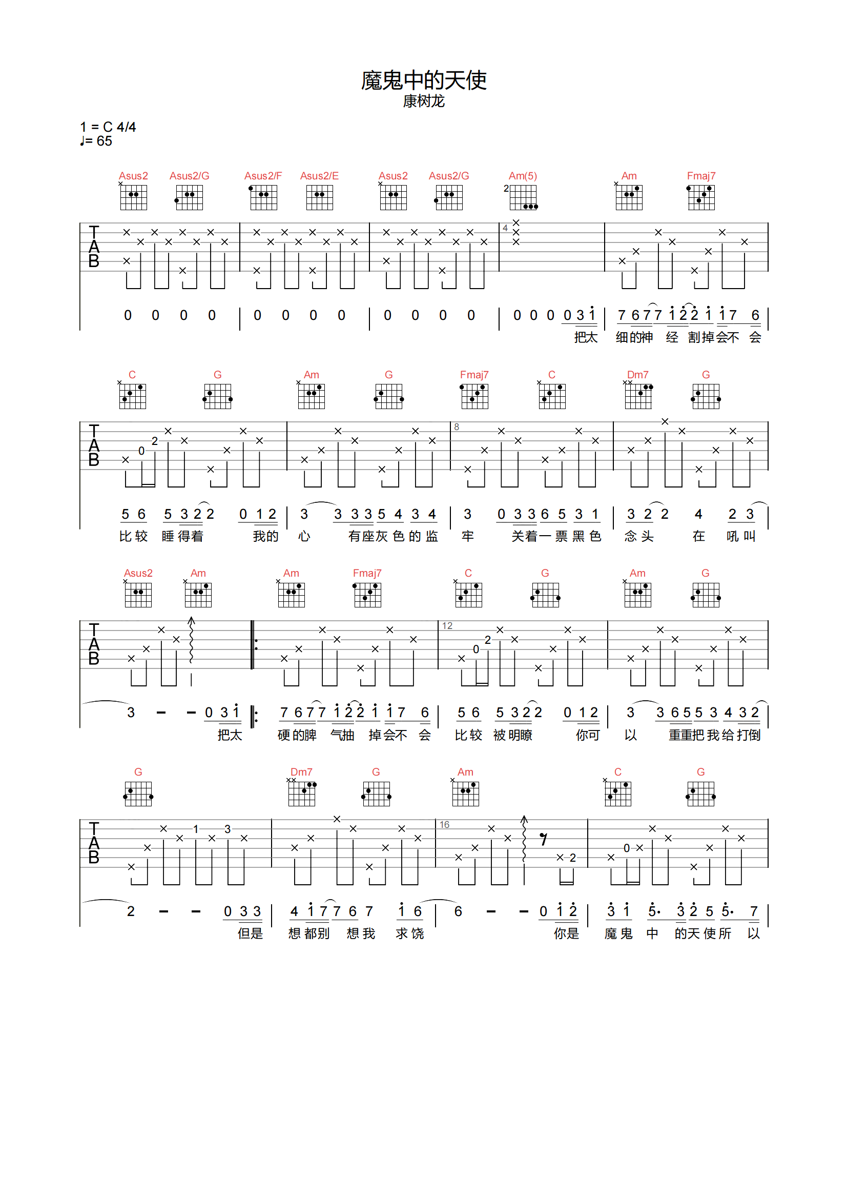 魔鬼中的天使吉他谱 - 康树龙/简亦弘 - C调吉他弹唱谱 - 原版