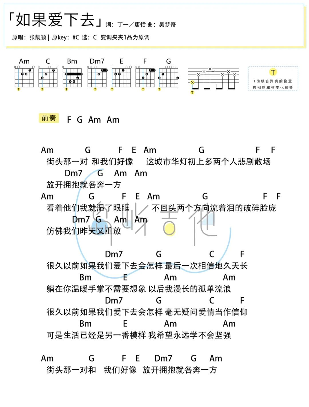 曲谱介绍: 《如果爱下去》吉他弹唱谱,选用C调指法,原调#C,CAPO夹1品弹唱原调,共有1张六线谱+1张图片谱,弹唱难度3级较简单。