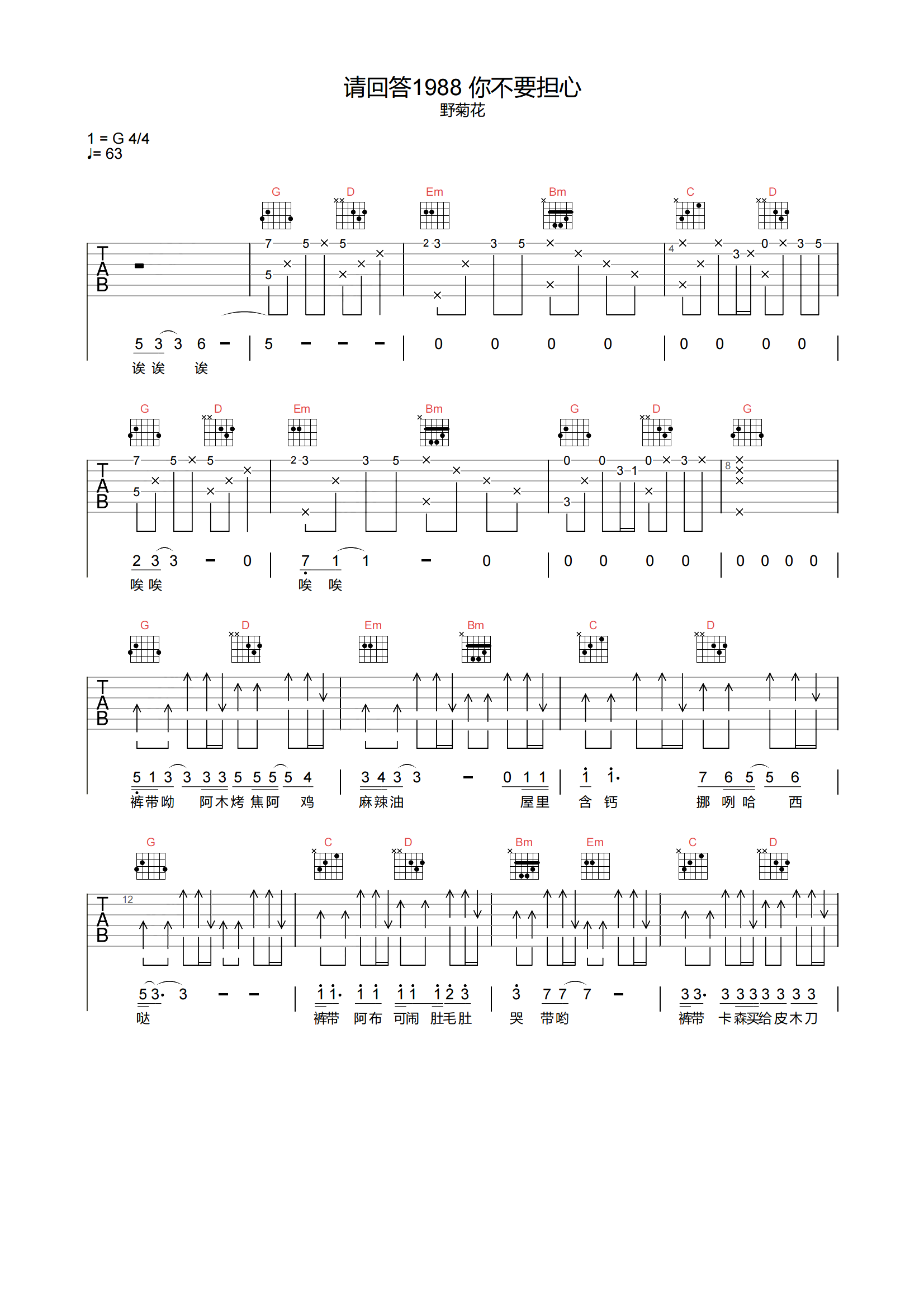 请回答1988吉他谱 - 野菊花 - G调吉他弹唱谱 - 原版
