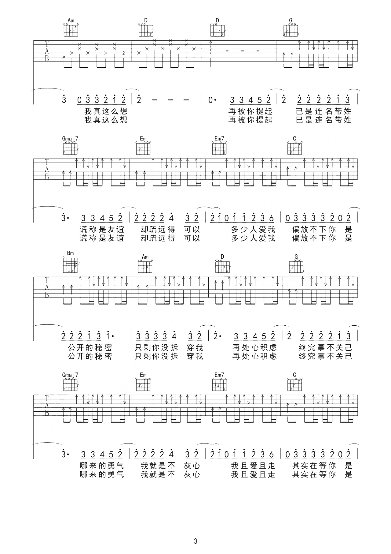 曲谱介绍: 连名带姓吉他谱,张惠妹演唱,讲究极简,却不敷衍。大部分段落只有简单的钢琴和弦伴奏,任由张惠妹在安静的氛围下稳稳诉说。中部,以一段分量适中的弦乐SOLO打开,伤感情绪一下子被点燃,而张惠妹的嗓音则添加了力量,微弱的气息和哭腔、乃至尾音,都处理得令人难忘。 《连名带姓》吉他弹唱谱,选用G调指法,原调bA,CAPO夹1品弹唱原调,含前奏按原版编配,难度3级较简单,随谱附PDF版本的下载。