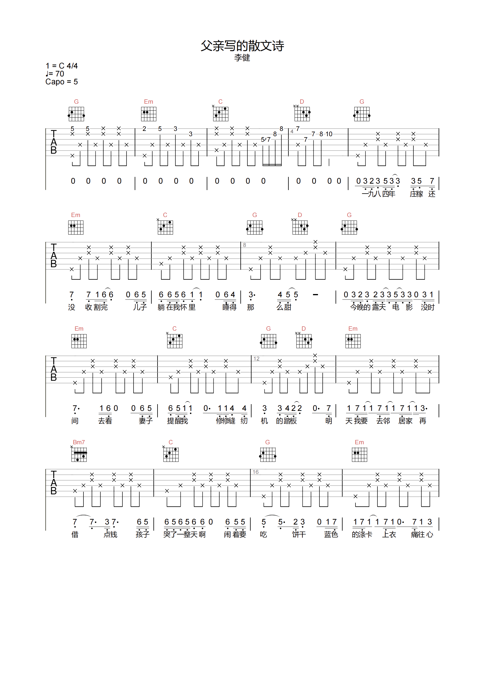 曲谱介绍: 父亲写的散文诗吉他谱,李健在《歌手》中演唱的现场版本,原曲是许飞,李健那种阳光,年轻,正能量的印象标签,完美的和歌曲融合在了一起,深情诠释时光流淌结出的父爱之诗。 《父亲写的散文诗》吉他弹唱谱,选用C调指法,原调F调,CAPO夹5品弹唱原调,速度控制在70拍每分钟,节奏4/4拍,随谱附PDF的版本下载。