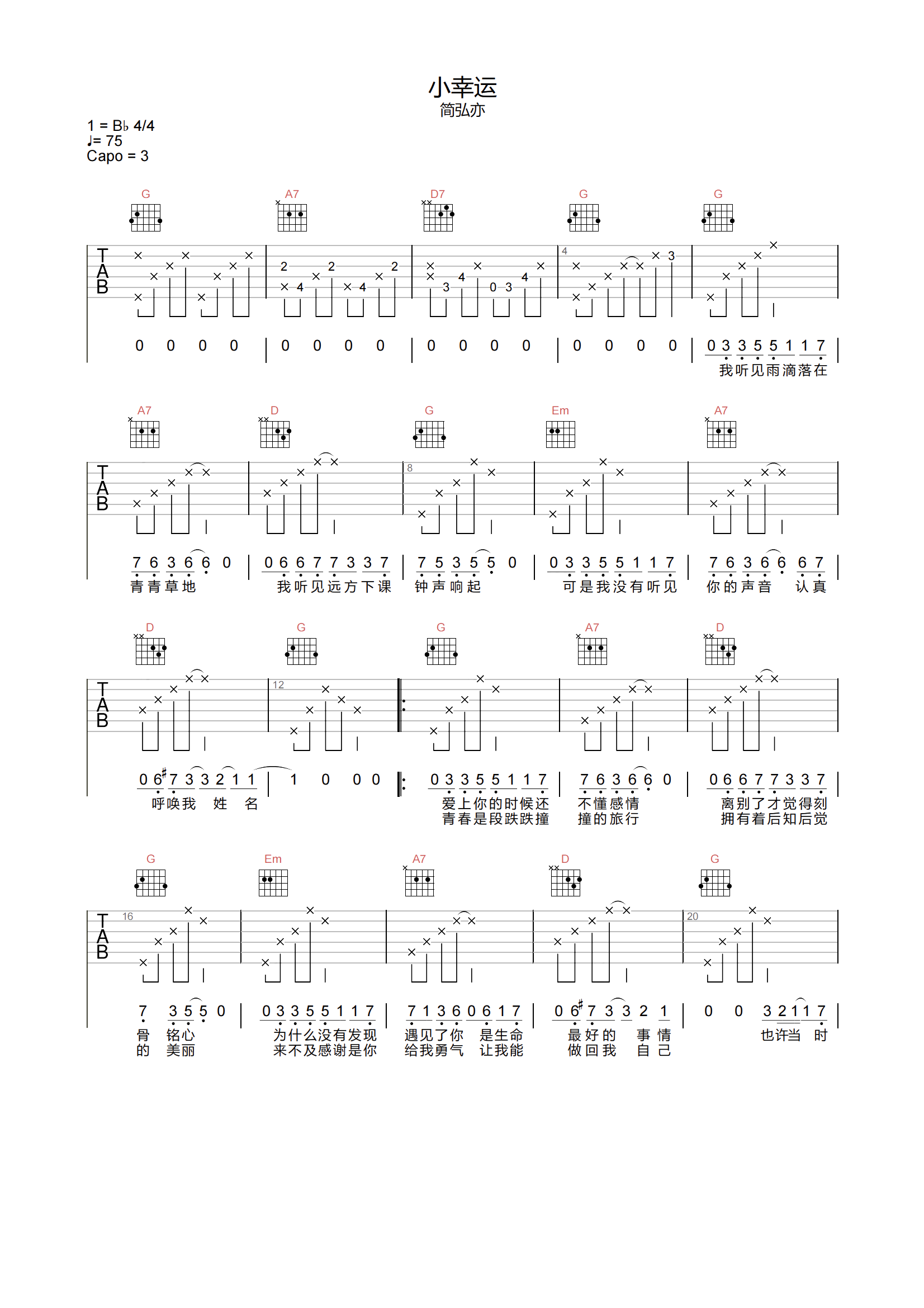 曲谱介绍: 小幸运吉他谱,简弘亦翻唱的田馥甄版本,也是电影《我的少女时代》主题曲,曾经清新独特的味道,捕获了多少年轻人的恋恋之心,完整的诠释了爱情中那份少有的纯粹与美好。 《小幸运》吉他弹唱谱,选用G调指法,原调bB,速度75拍每分钟,节奏4/4拍,难度4级较简单,随谱下方附本谱的PDF版本下载。