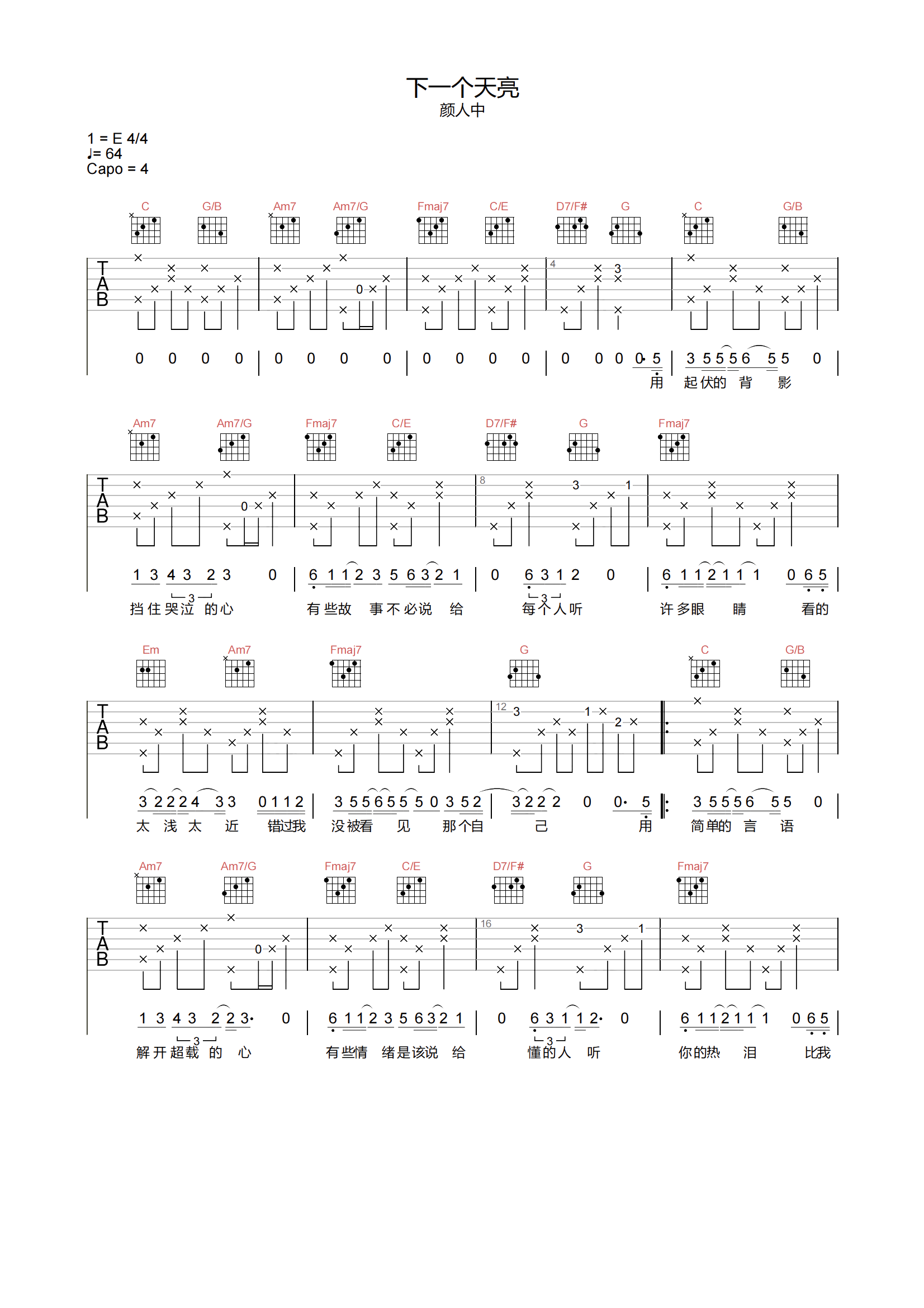 曲谱介绍: 下一个天亮吉他谱,颜人中翻唱的男声版本,歌曲的质感细腻且安静的表达着深刻的情绪,慢拍的鼓点配合着歌曲,仿佛时刻都在触及着我们的心灵,治愈且回忆满满。 《下一个天亮》吉他弹唱谱,选用C调指法,CAPO夹4品弹唱原调E调,原版带前奏,难度4级较简单。下方附有本谱的PDF版本下载,感兴趣琴友别错过。