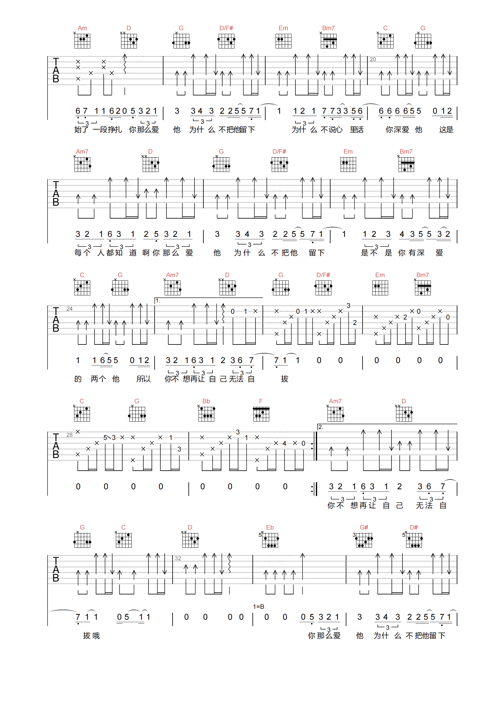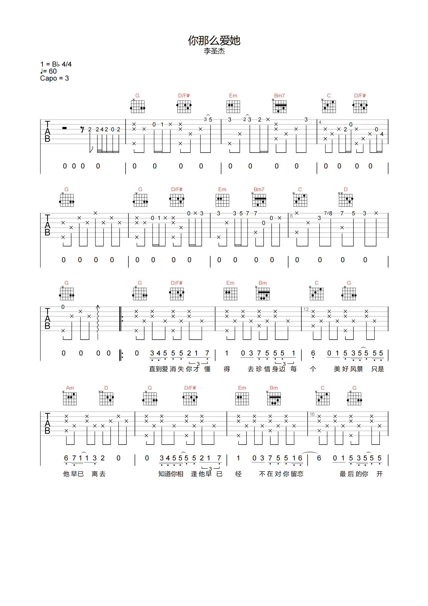 曲谱介绍: 你那么爱她吉他谱,李圣杰独唱的版本,这首歌曾经与林隆璇的合唱缠绕在我们脑海的记忆中,而独唱版本更多了一份安静的陈述感。歌曲诠释着三角关系的感情推拉,总会让我们不由得想起或许曾经出现在自己身上的一些故事。 《你那么爱她》吉他弹唱谱,选用G调指法,原调bB,CAPO夹3品弹唱原调,速度控制在60拍每分钟,节奏4/4拍,难度4级较简单。另外,在本页下方附曲谱的PDF版本下载。