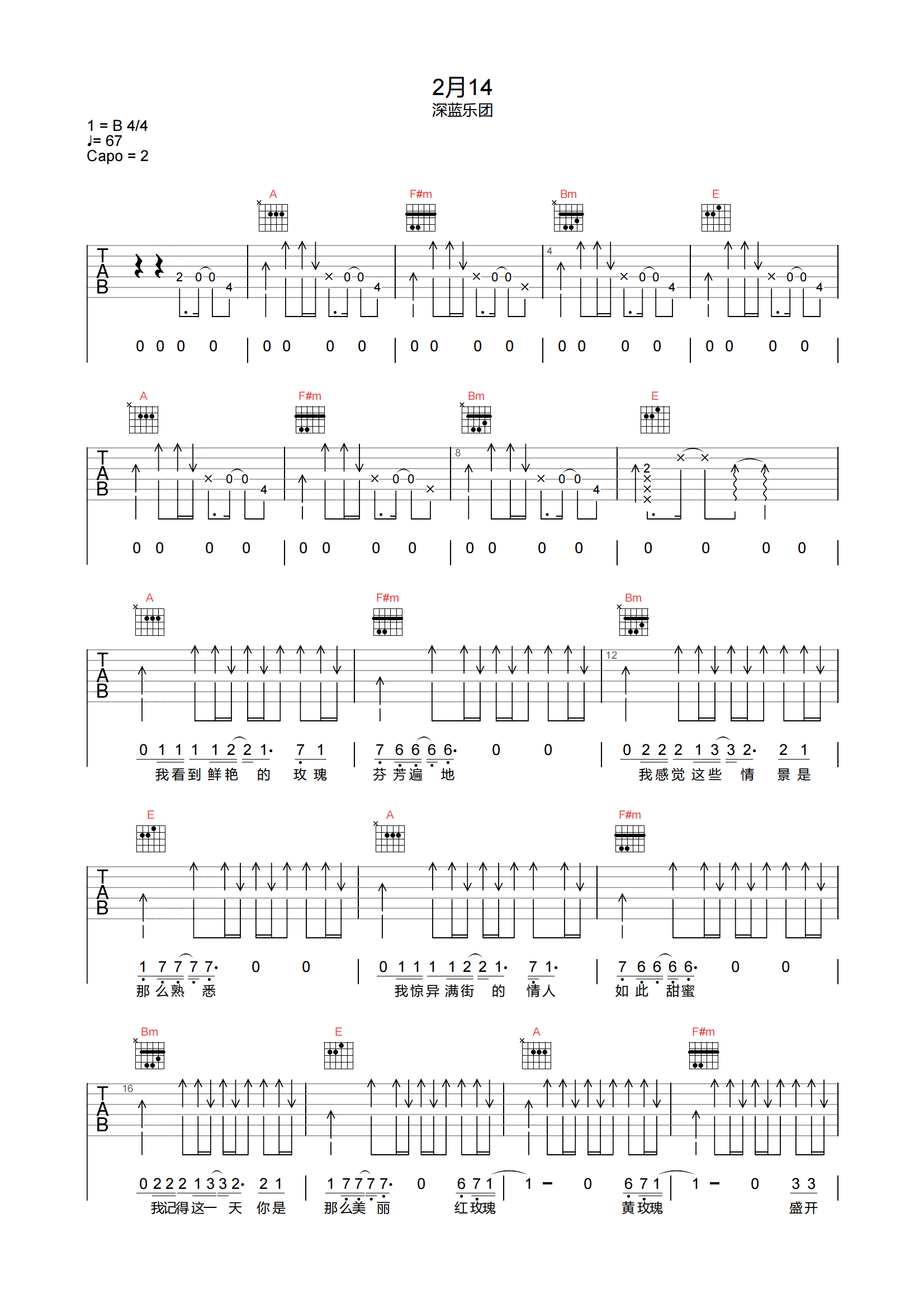 曲谱介绍: 2月14吉他谱,深蓝乐团演唱的歌曲,这一首歌就如同一台时光机,听到过的人都可以坐着机器回到曾经,和曾经的自己打个照面,询问一下生活最近过得还怎样,感伤一下过去,憧憬一下未来,给予当下力量! 《2月14》吉他弹唱谱,选用G调指法,CAPO夹2品弹唱原调B调,速度67拍每分钟,节奏4/4拍,本谱含前奏按原版编配,难度5级适中。下方提供了本谱的PDF版本,感兴趣的琴友可以下载哦!