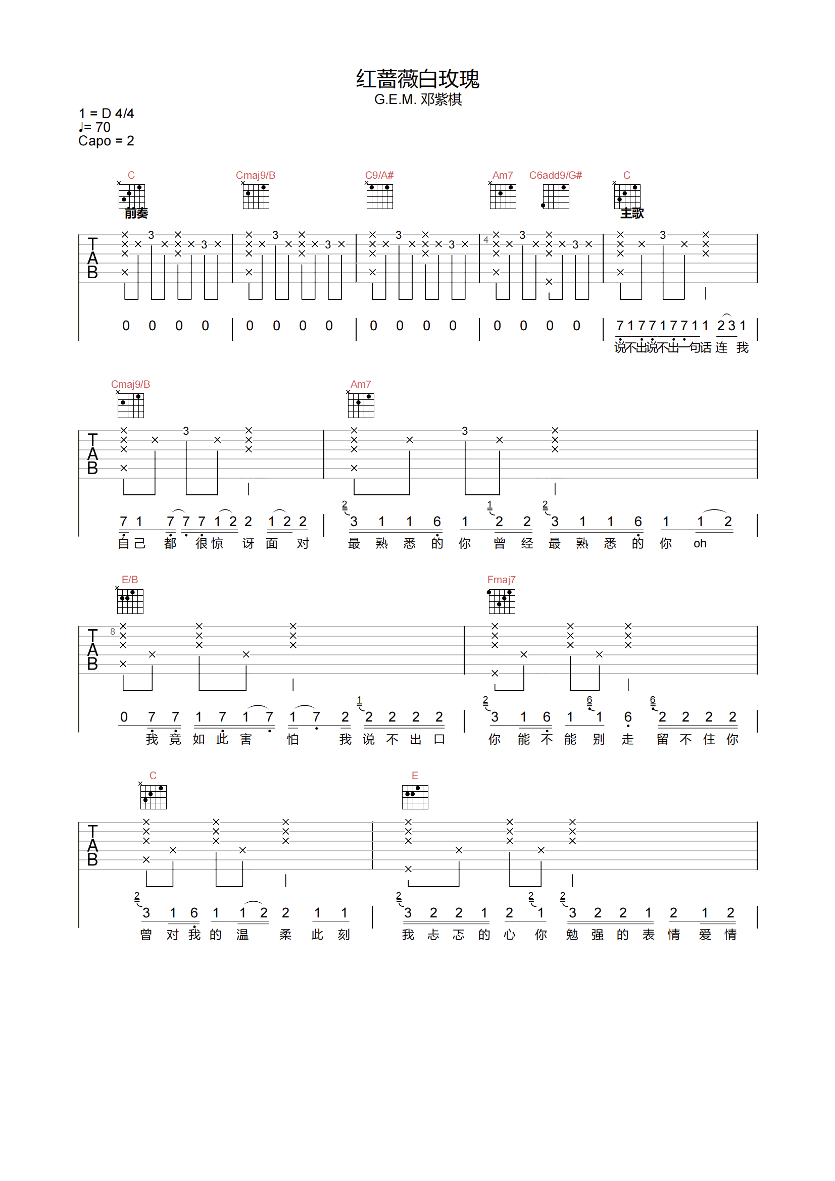 红蔷薇白玫瑰吉他谱 - 邓紫棋 - C调吉他弹唱谱 - 原版